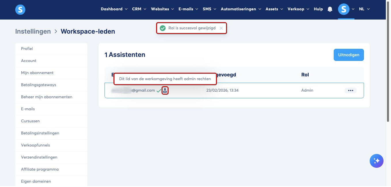 - Zodra de rechten zijn toegekend, verschijnt er een beheerders‑icoon naast hun e‑mailadres en krijg je een melding ter bevestiging van de wijziging.
