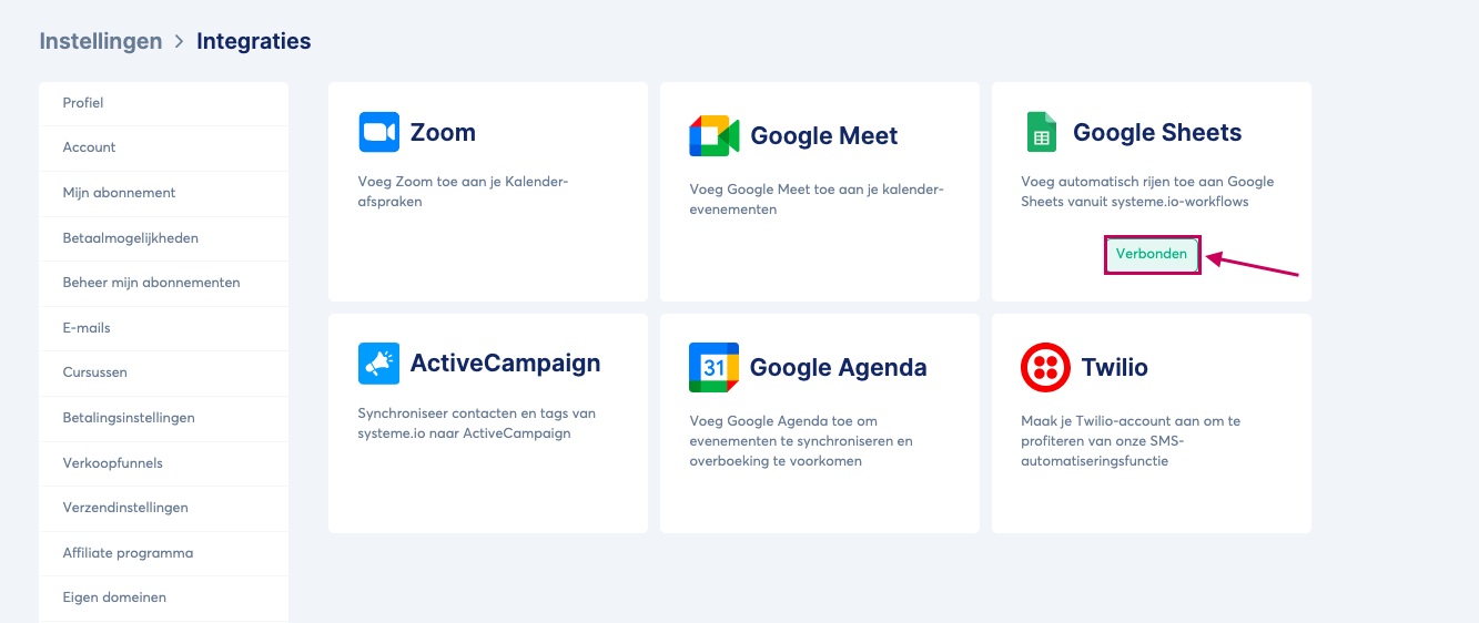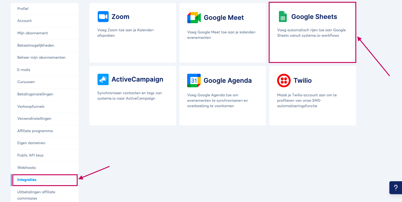 3. Klik op ‘Google Sheets’ tussen de beschikbare integraties om een Google-account toe te voegen aan je systeme.io-account.