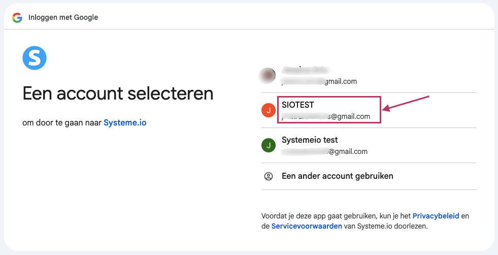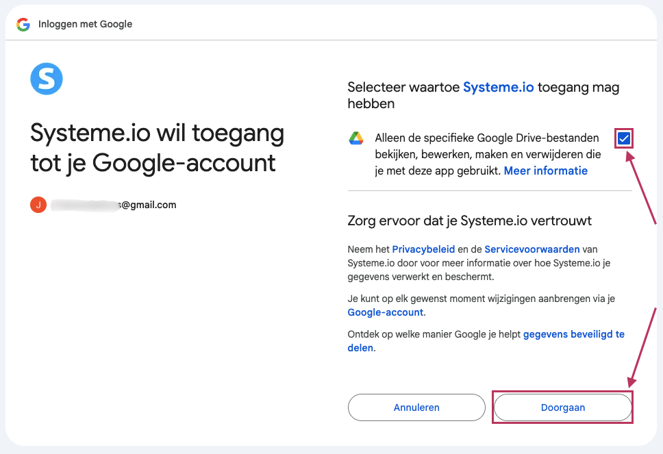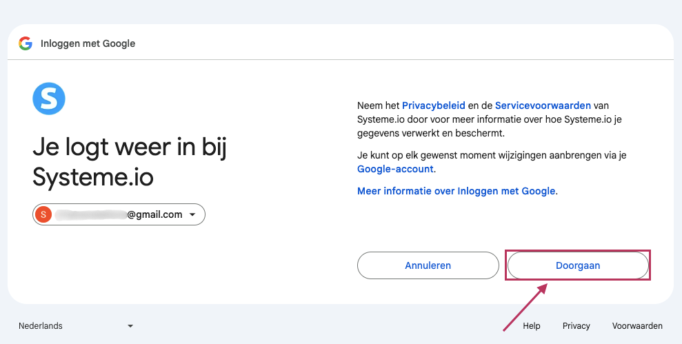- Klik op “Doorgaan” om Google toestemming te geven je informatie te delen met systeme.io.