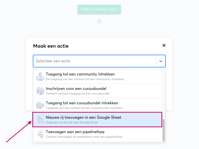 Zodra de integratie is ingesteld, kun je de actie “Voeg een nieuwe rij toe aan een Google Sheet” gebruiken in je workflows, waardoor je automatisch gegevens kunt toevoegen aan een Google-Sheets werkblad op basis van triggers die je definieert in je workflows.