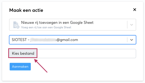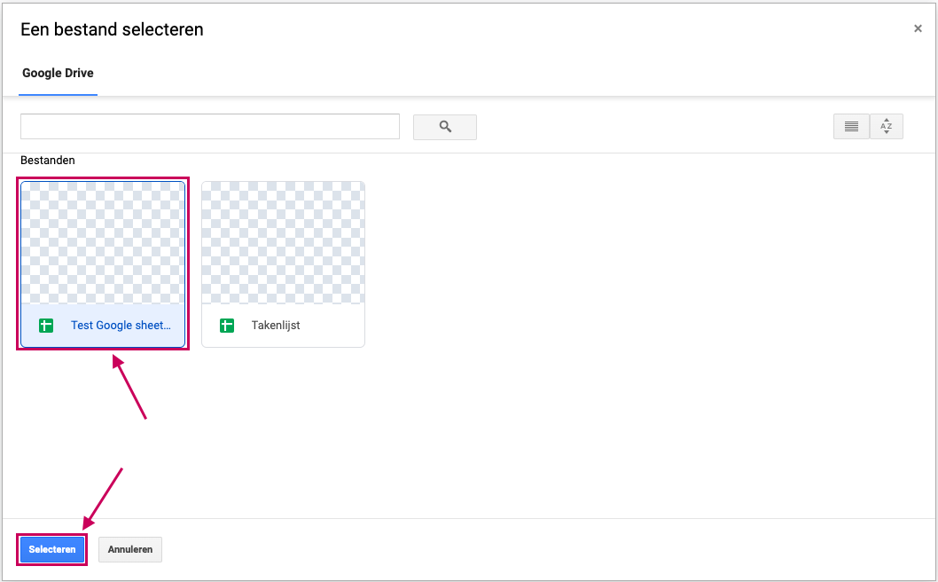 - Voeg een Google-bestand toe: Kies het Google-bestand waaraan je wilt werken uit je beschikbare bestanden door eerst op “Kies bestand” te klikken.