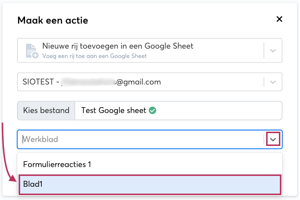 - Selecteer de actie: Kies in je Workflow de actie “Nieuwe rij toevoegen in een Google Sheet.”