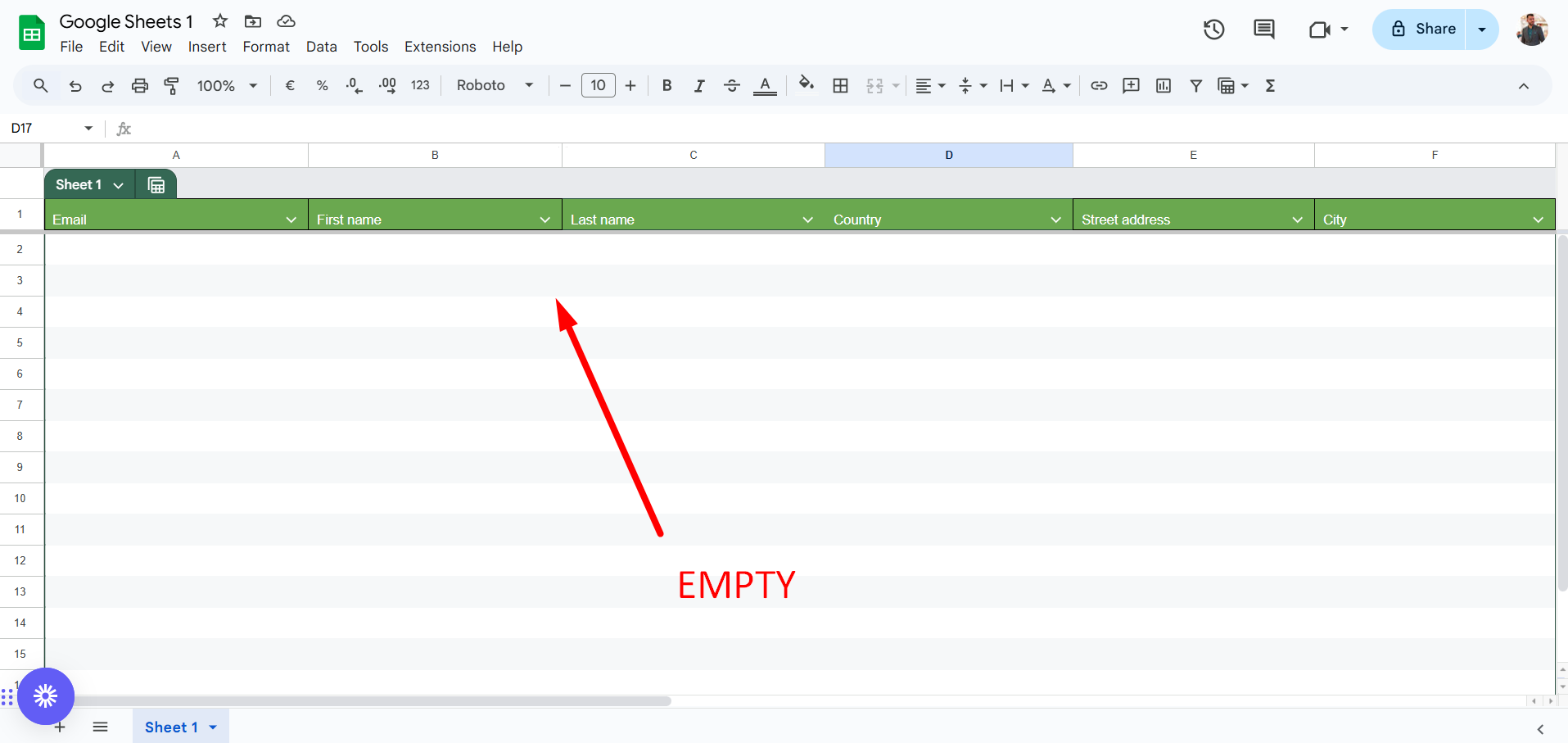 Belangrijk: zorg ervoor dat je werkblad al kolommen met titels bevat, want de huidige integratie ondersteunt het maken van nieuwe Google Sheets vanaf nul niet.