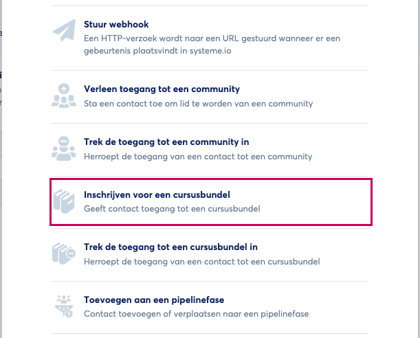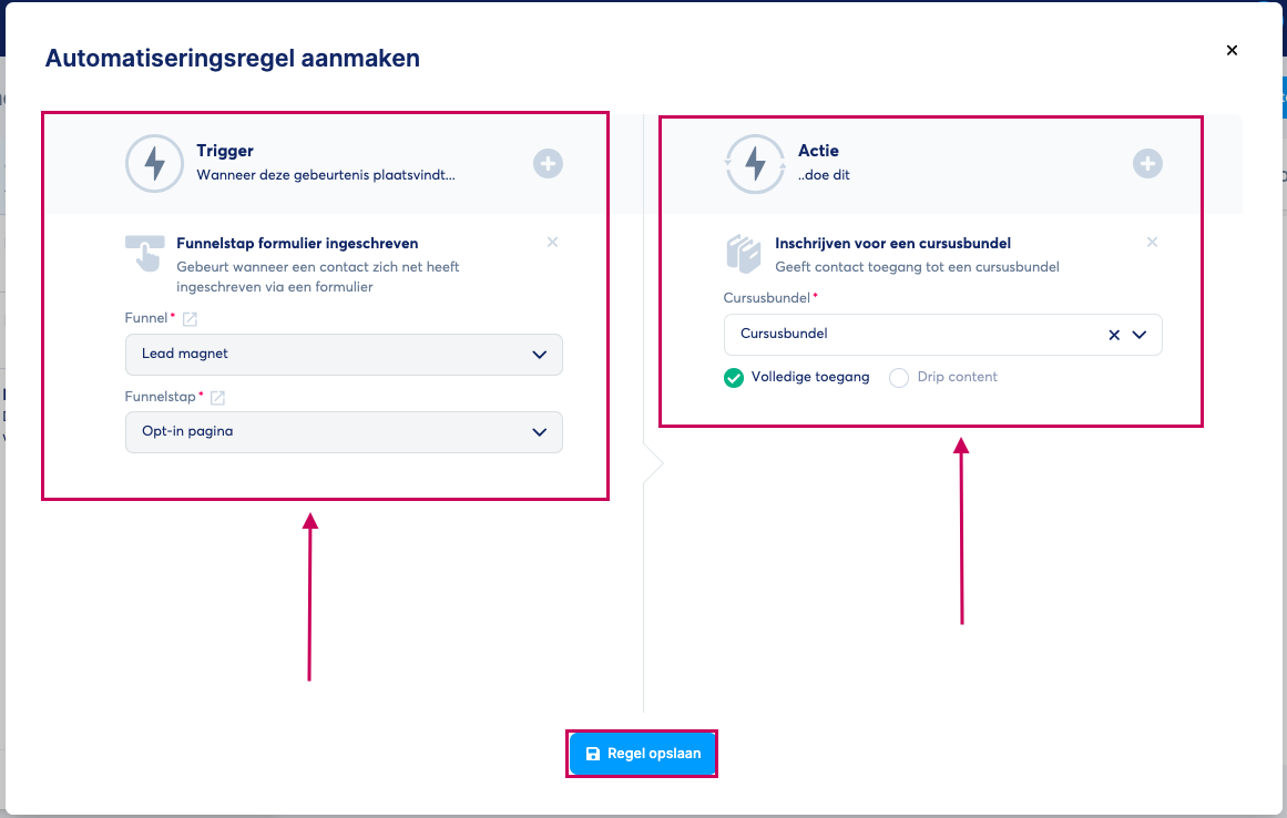 Op deze manier wordt de automatisering gestart zodra contacten zich inschrijven op de aanmeldpagina, en worden je studenten automatisch ingeschreven voor de geselecteerde cursusbundel.