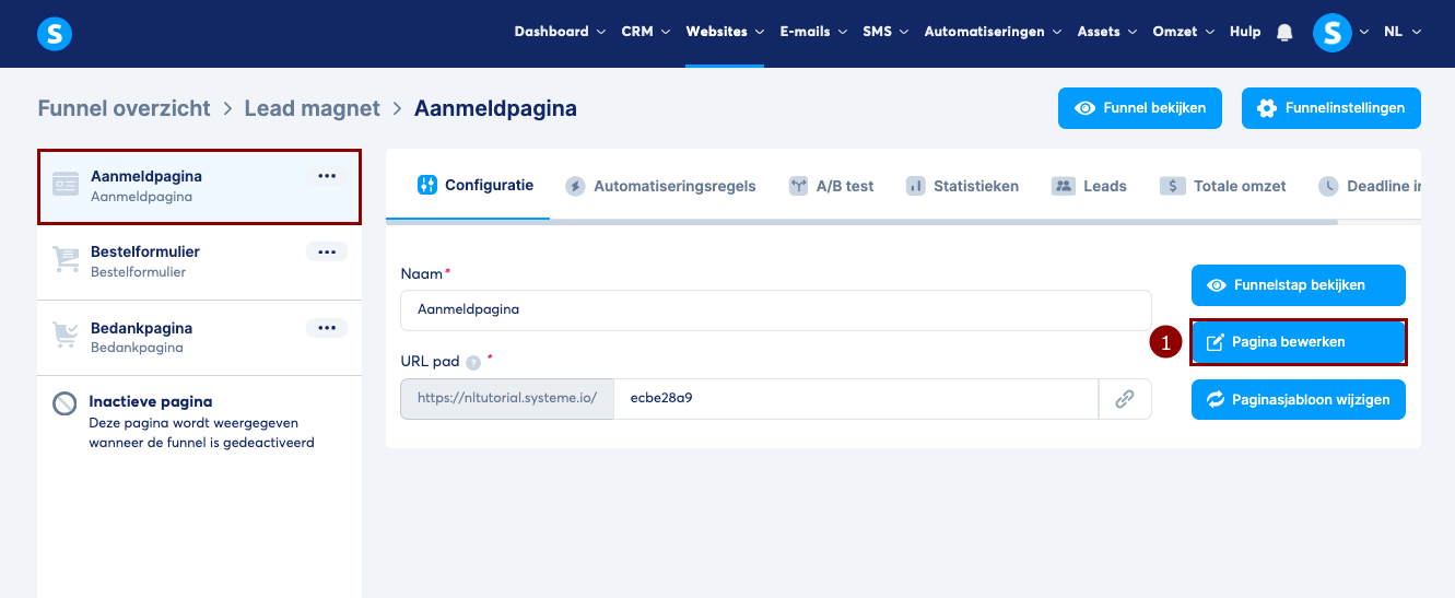 - Klik in de funnel editor op de pagina die het formulier bevat, en klik daarna op "Pagina bewerken" (1).