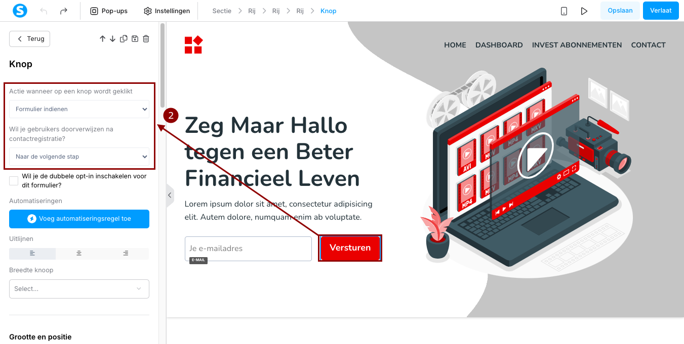 - Klik op de knop van het formulier om de instellingen weer te geven in het paneel aan de linkerzijde. Voor het veld Actie wanneer op een knop wordt geklikt, selecteer Formulier indienen, en kies om de gebruiker door te sturen naar de pagina van jouw keuze (2).
