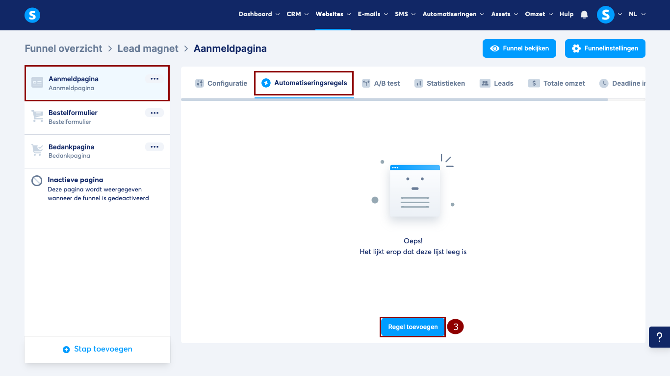 - Verlaat de editor en open de tabblad Automatiseringsregels op dezelfde pagina. Klik vervolgens op de knop Regel toevoegen. (3)