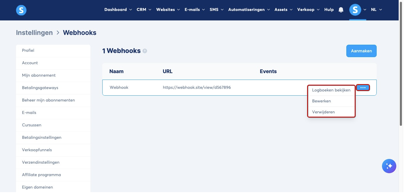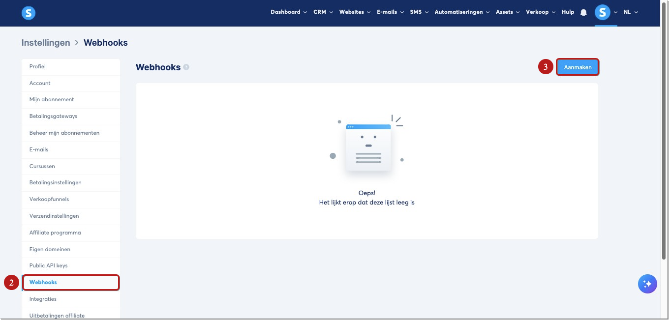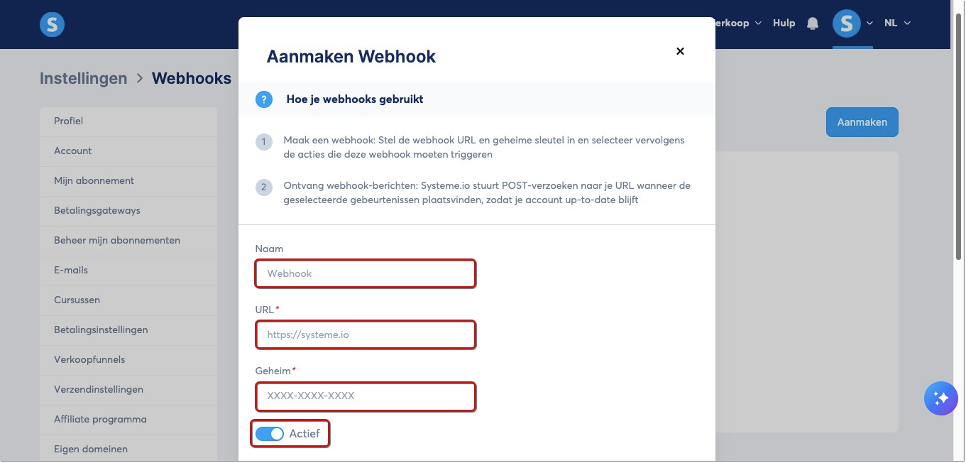 Om een webhook in te stellen in je systeme.io-account, volg je deze eenvoudige stappen: