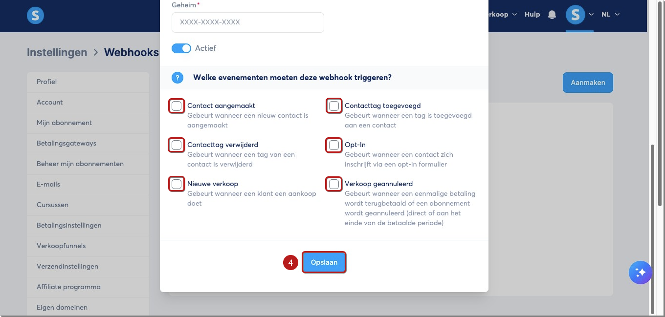Selecteer de gebeurtenissen die de webhook in systeme.io moeten activeren. En klik tot slot op Opslaan (4) om te bevestigen.