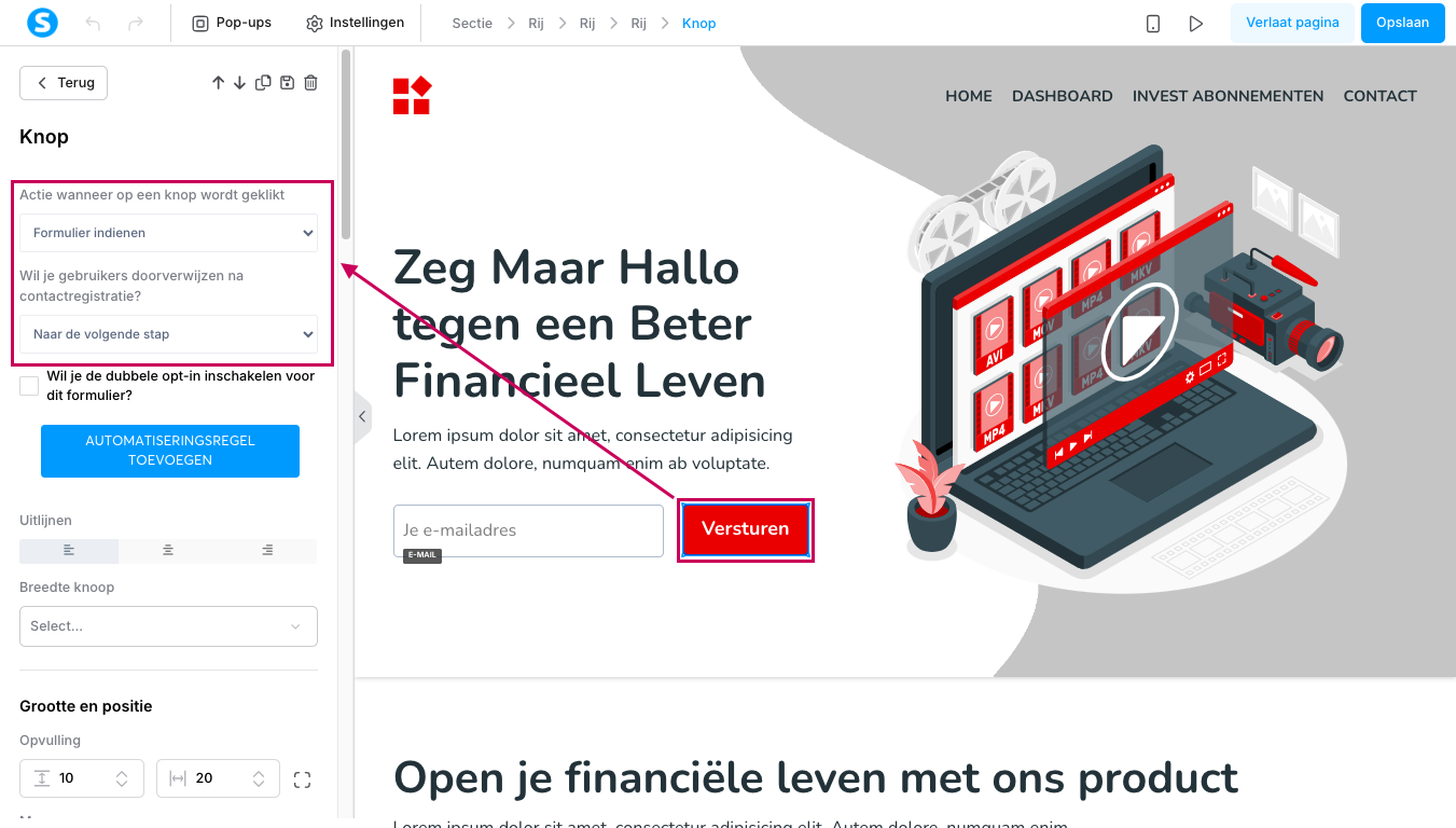 - Bij de optie “Actie wanneer op een knop wordt geklikt”, selecteer “Formulier indienen”.
