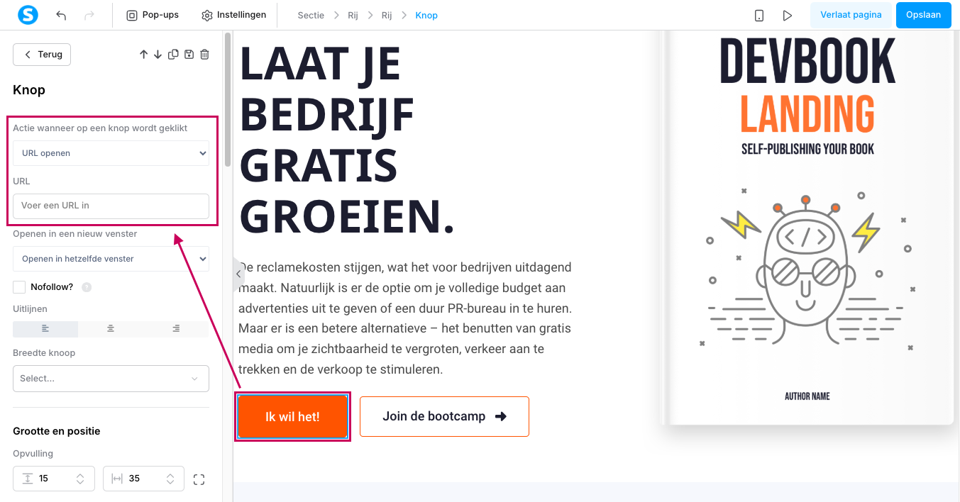 - Bij “Actie wanneer op een knop wordt geklikt”, selecteer “URL openen”.