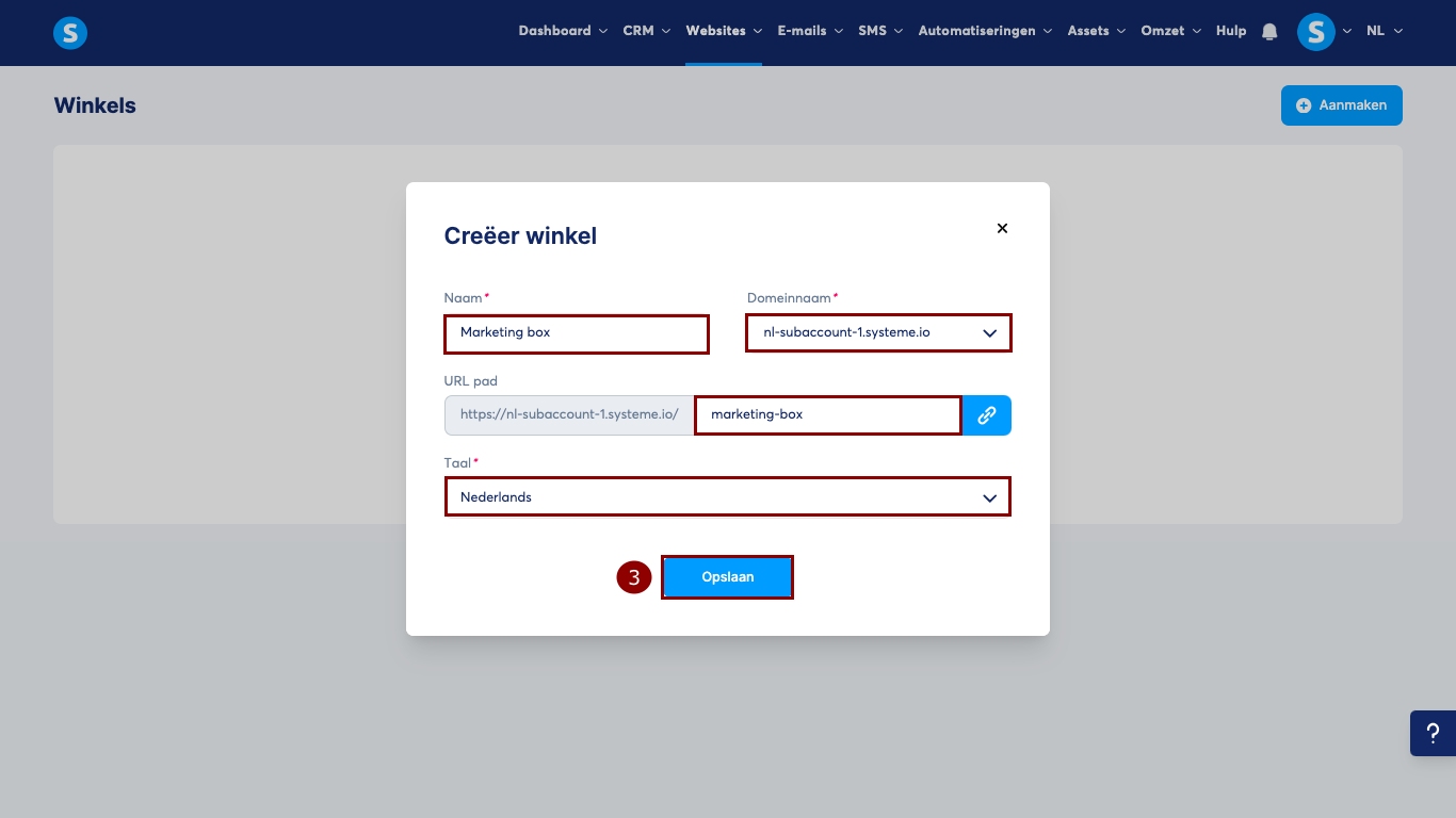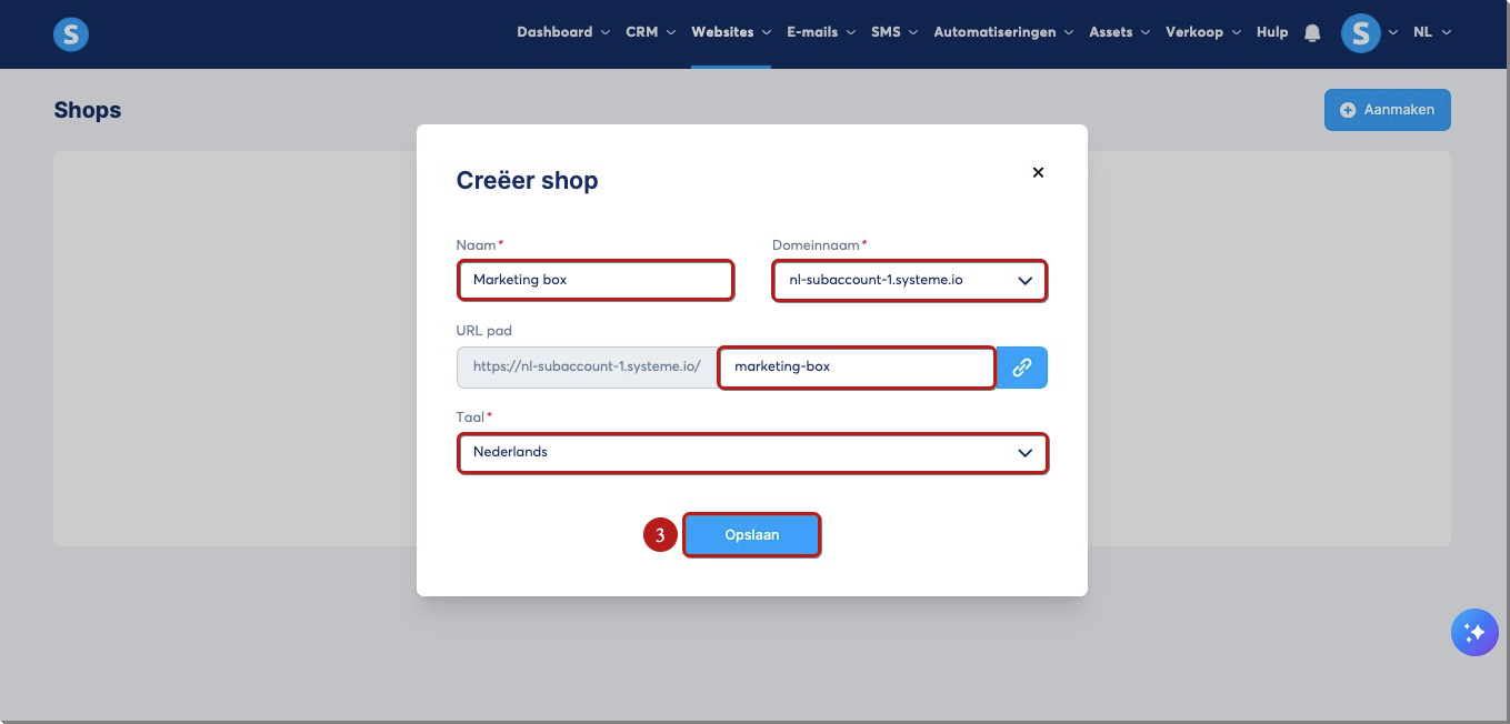 Er verschijnt een pop-up waarin je de naam, het domein, het URL-pad en de taal moet invoeren. Klik vervolgens op Opslaan (3) om het aanmaken van de nieuwe creator shop te voltooien.