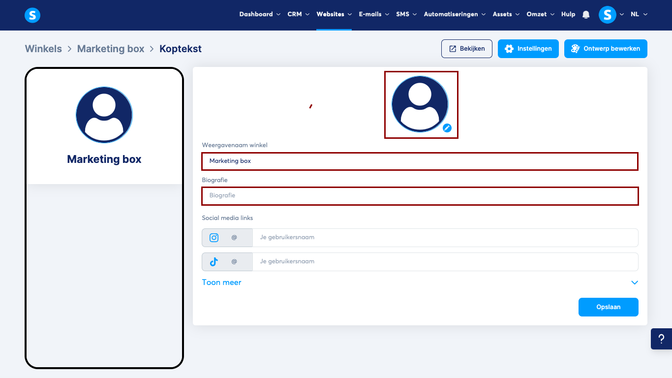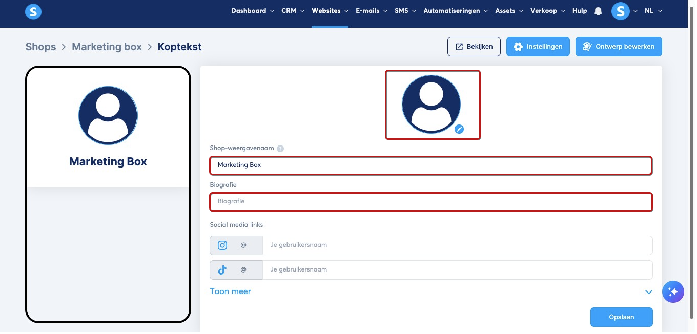 In de koptekst kun je de winkelafbeelding, naam en biografie aanpassen.