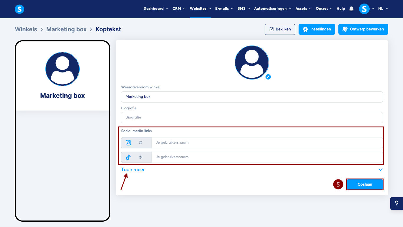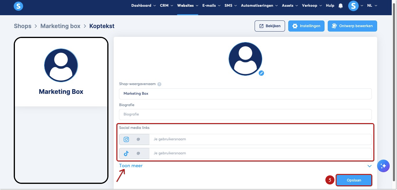 Je kunt ook links toevoegen naar je socialmedia-accounts, zoals Instagram en TikTok. Klik op Toon meer om alle beschikbare opties te zien, voer vervolgens je gebruikersnaam in en klik op Opslaan (5).