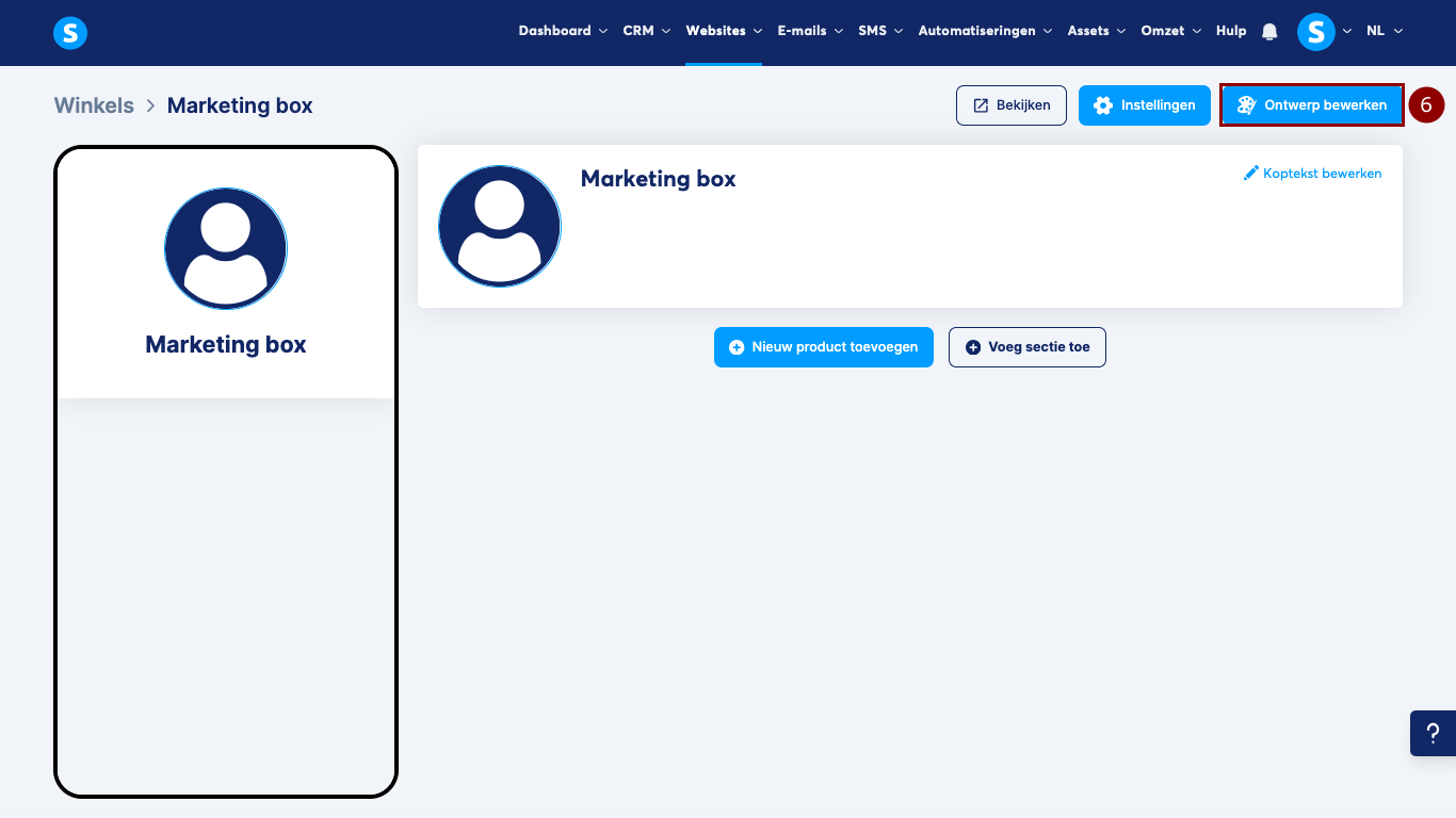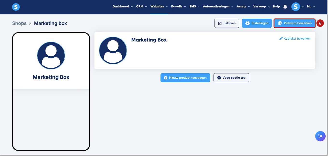 Je kunt het ontwerp van je winkel aanpassen door op Ontwerp bewerken (6) te klikken.