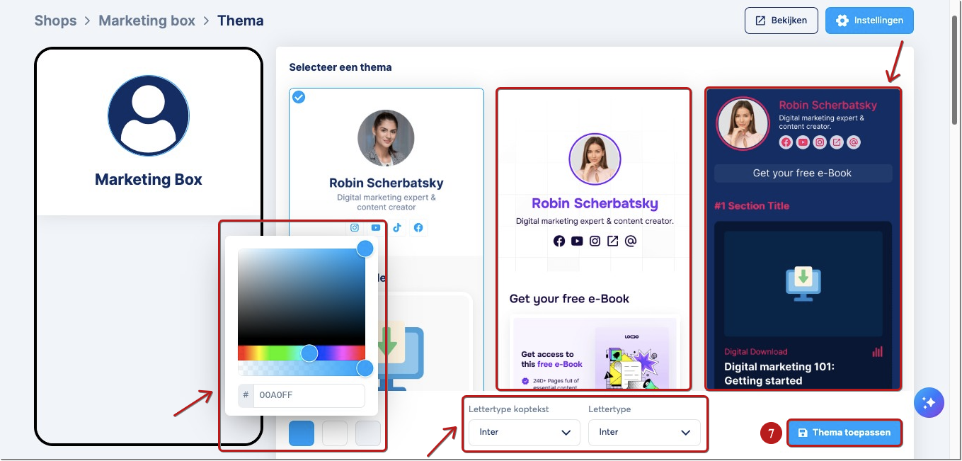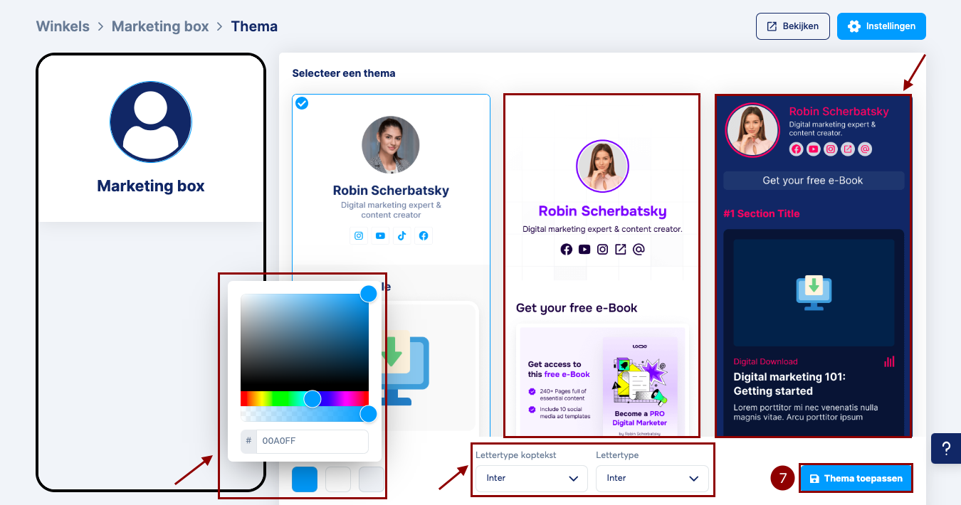 Je ziet verschillende themasjablonen waaruit je kunt kiezen. Selecteer het thema dat je het meest aanspreekt, pas de kleuren, het koplettertype en het hoofdlettertype aan met de weergegeven opties en klik vervolgens op Thema toepassen (7) om je ontwerp op te slaan.