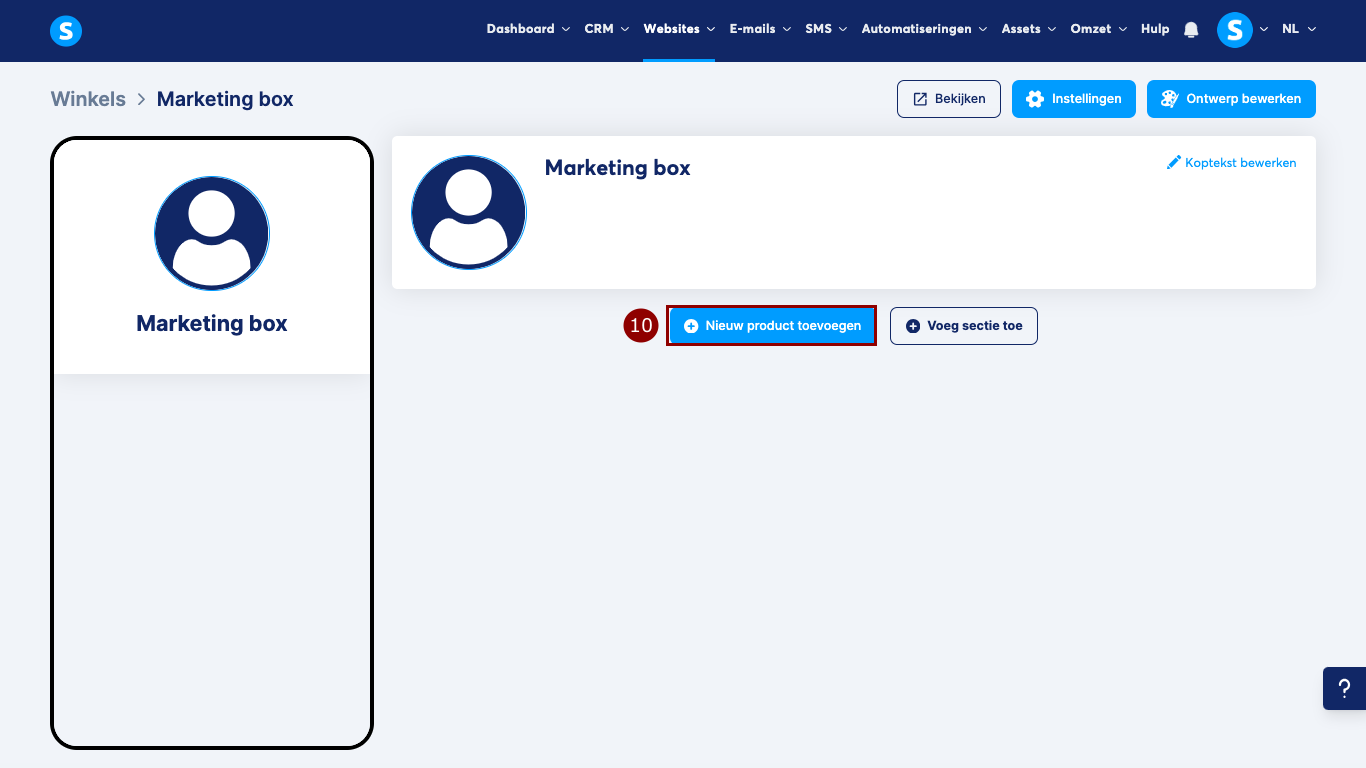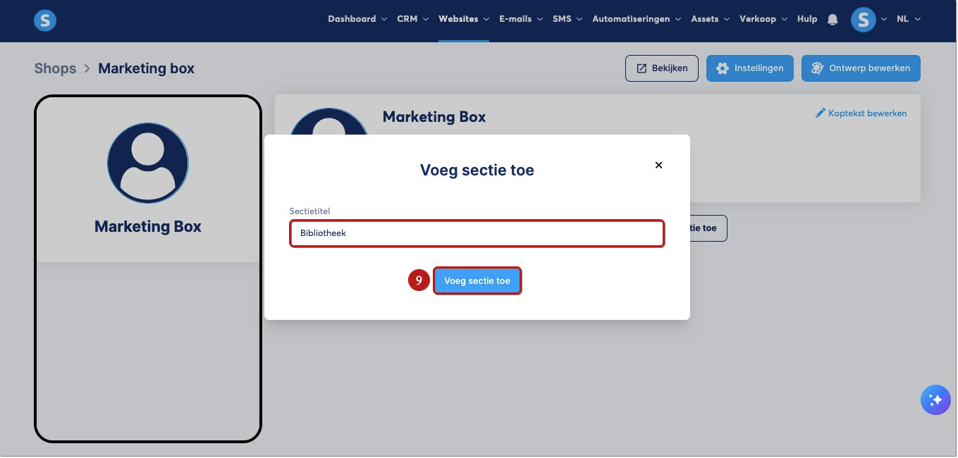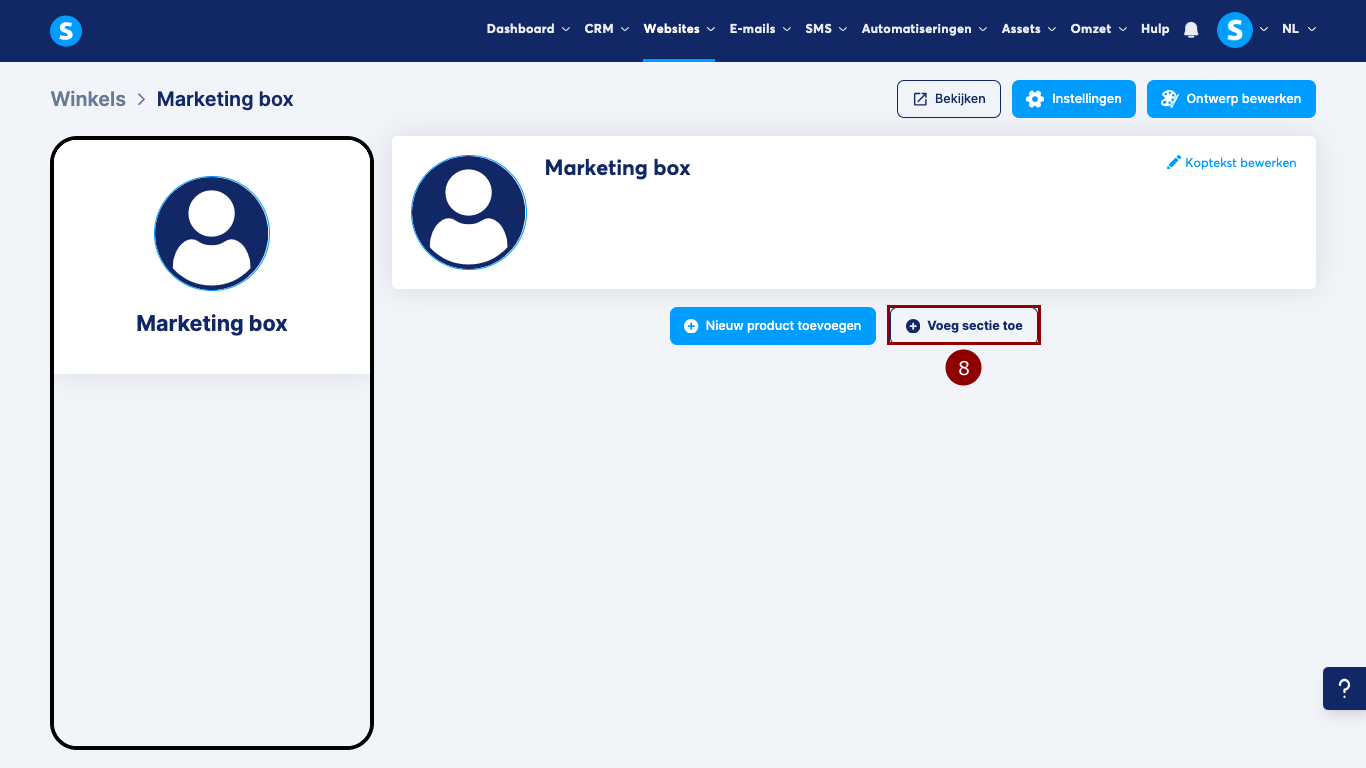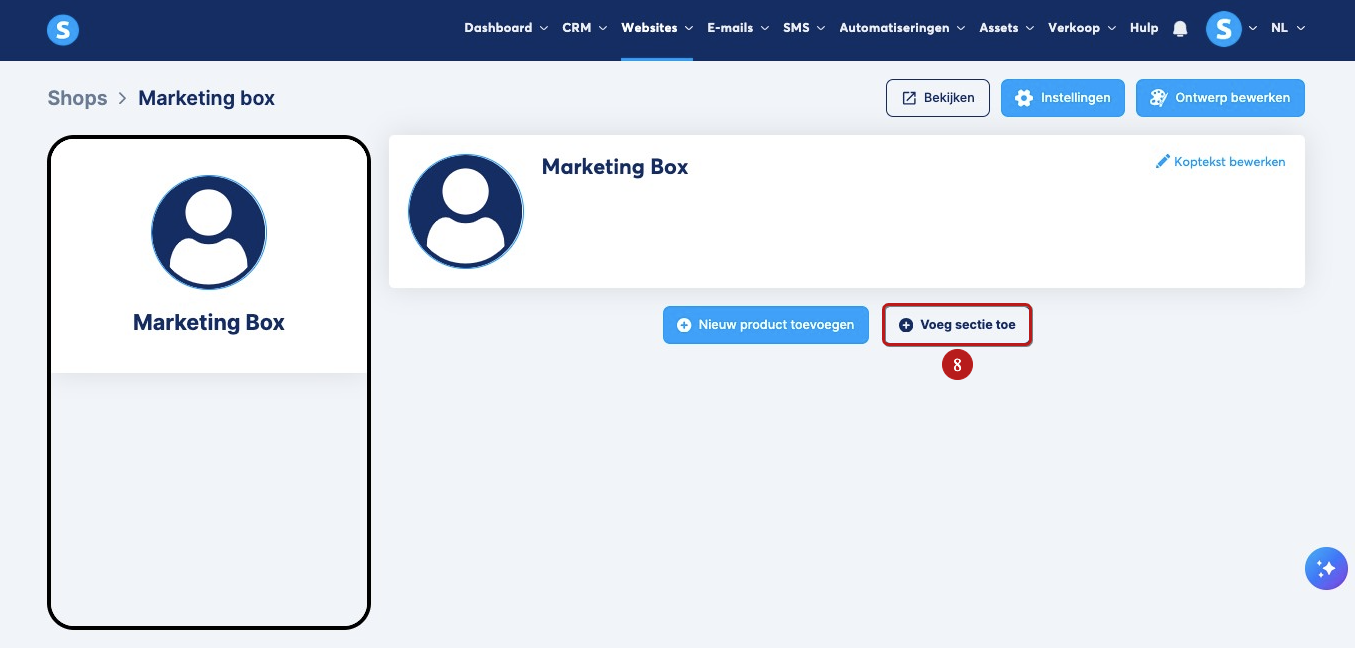 Je kunt een sectie aan je winkel toevoegen door op Voeg sectie toe (8) te klikken.