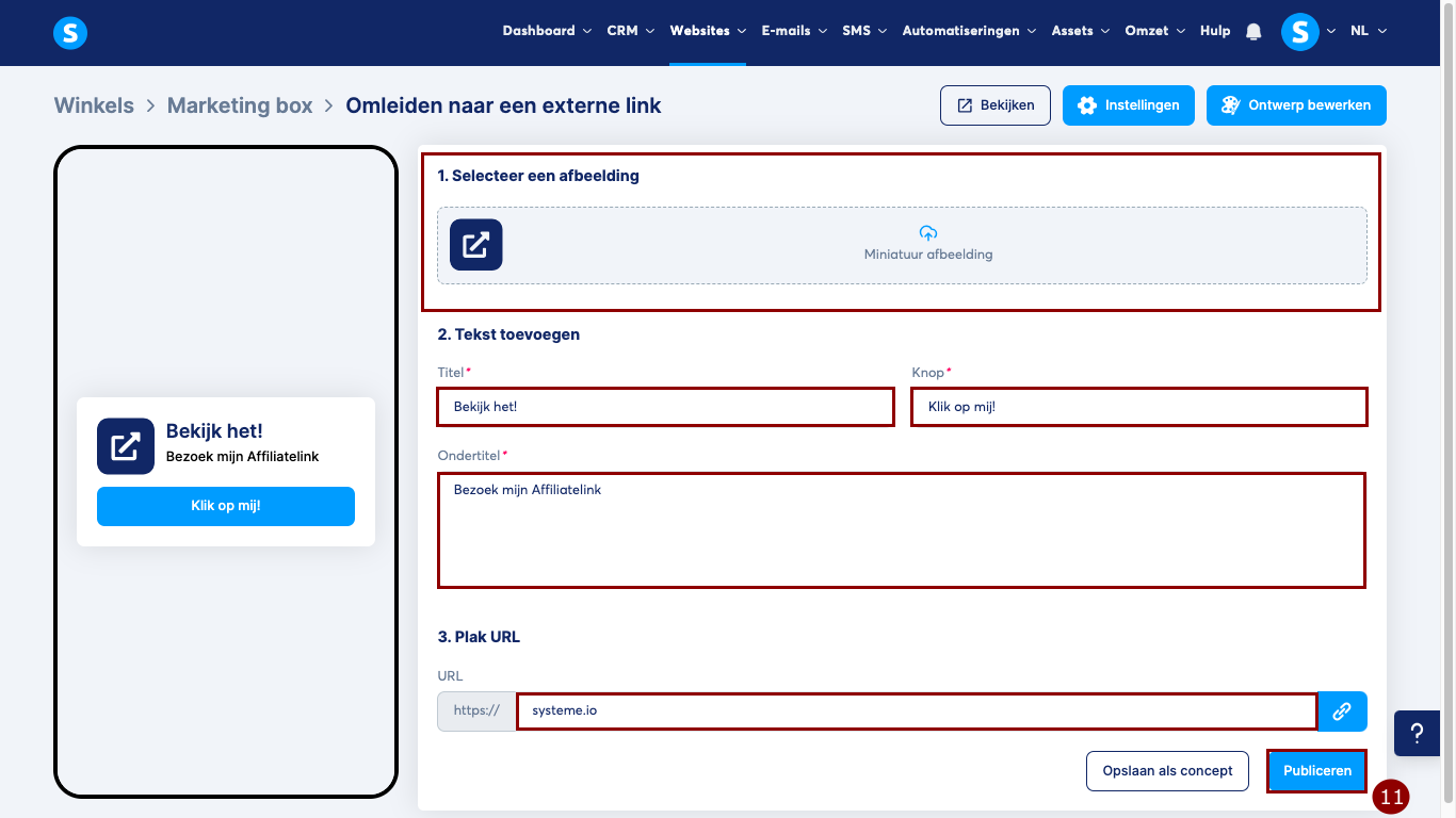Gebruik deze optie wanneer je je klanten wilt doorsturen naar een andere website, landingspagina of product buiten je winkel.