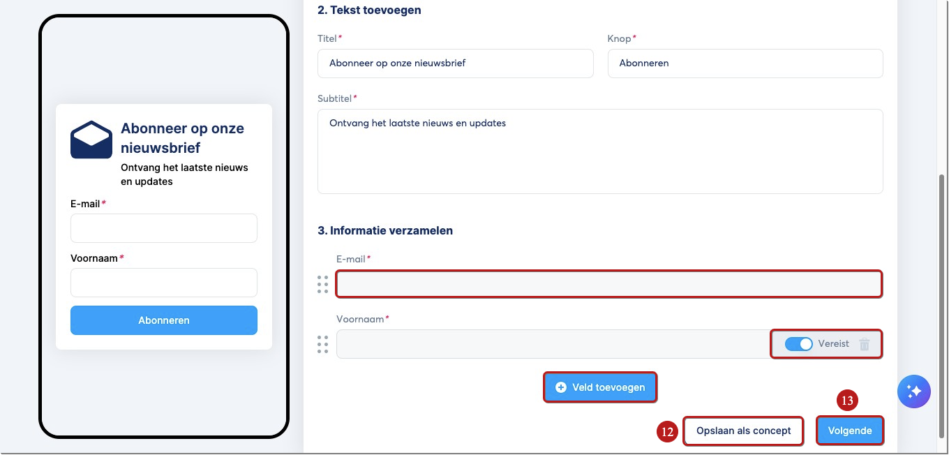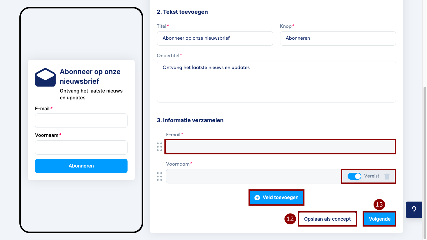 Voeg ook de velden toe waarvan je informatie wilt verzamelen van gebruikers die zich aanmelden. Standaard is het enige beschikbare veld E-mail. Je kunt ook andere velden toevoegen door op Veld toevoegen te klikken en bijvoorbeeld Voornaam te selecteren. Je kunt een veld ook verplicht maken door de Verplicht-knop in te schakelen.