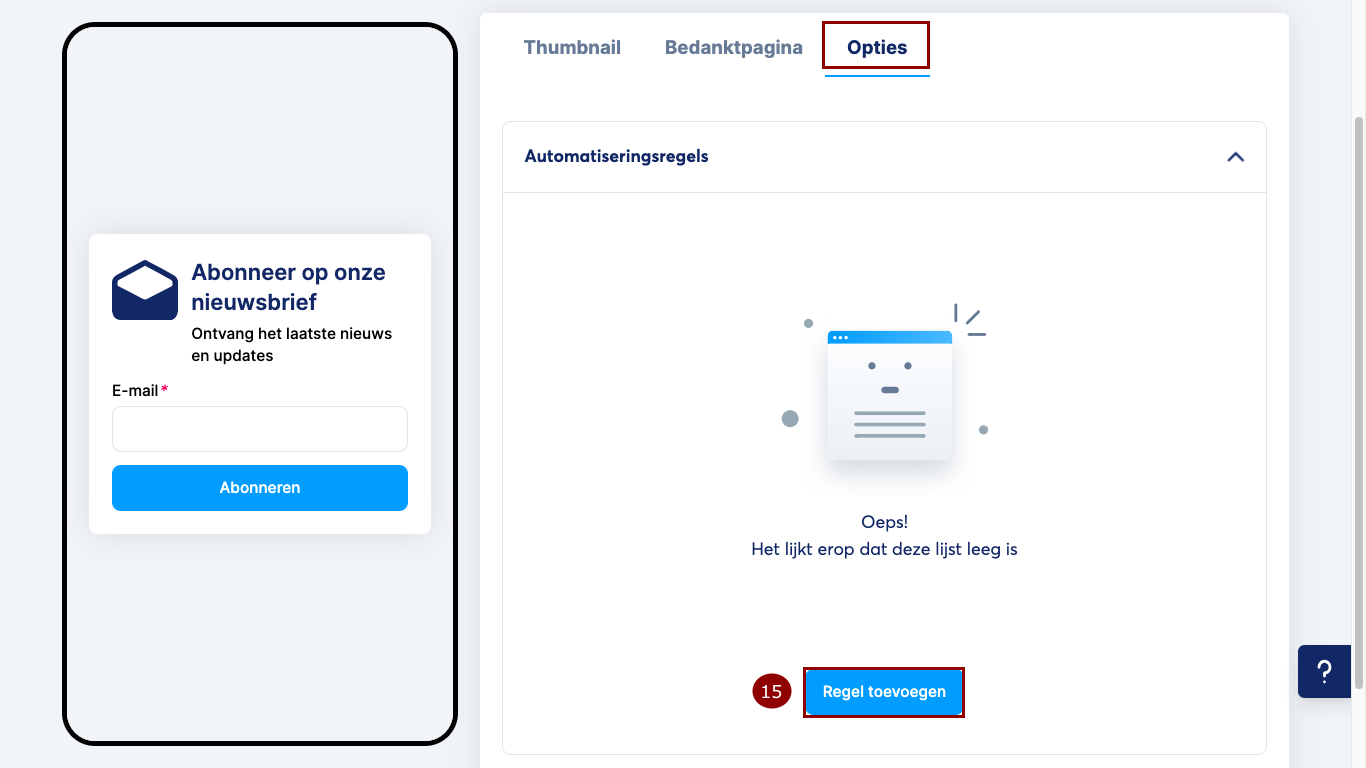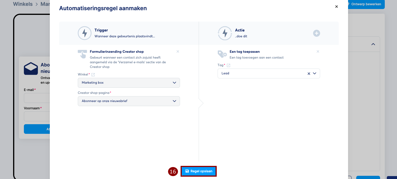 In het pop-upvenster dat verschijnt, kies je Formulierinzending Creator shop als trigger en selecteer je vervolgens de actie die je wilt uitvoeren nadat een lead zich heeft aangemeld via het E-mails verzamelen-gedeelte van je digitale winkel (in dit voorbeeld hebben we gekozen om een tag toe te passen). Klik tot slot op Regel opslaan (16).