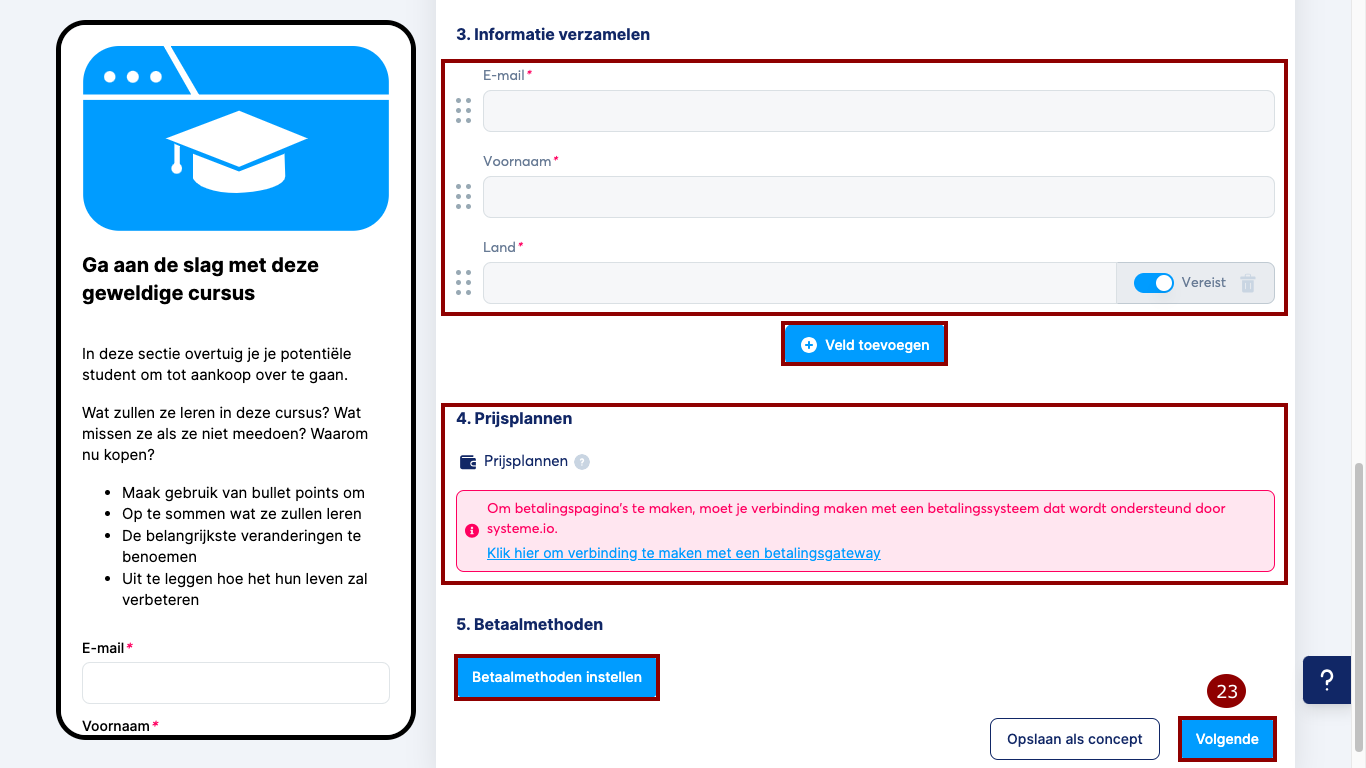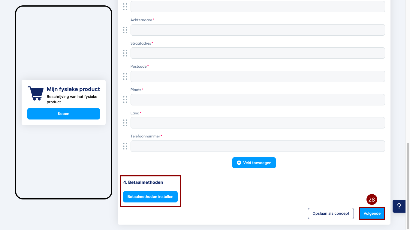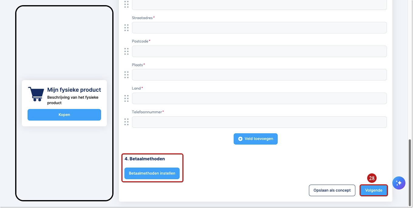 Selecteer vervolgens de betaalmethode die je wilt gebruiken door op Betaalmethoden instellen te klikken, en klik tenslotte op Volgende (28) om naar het laatste tabblad te gaan.