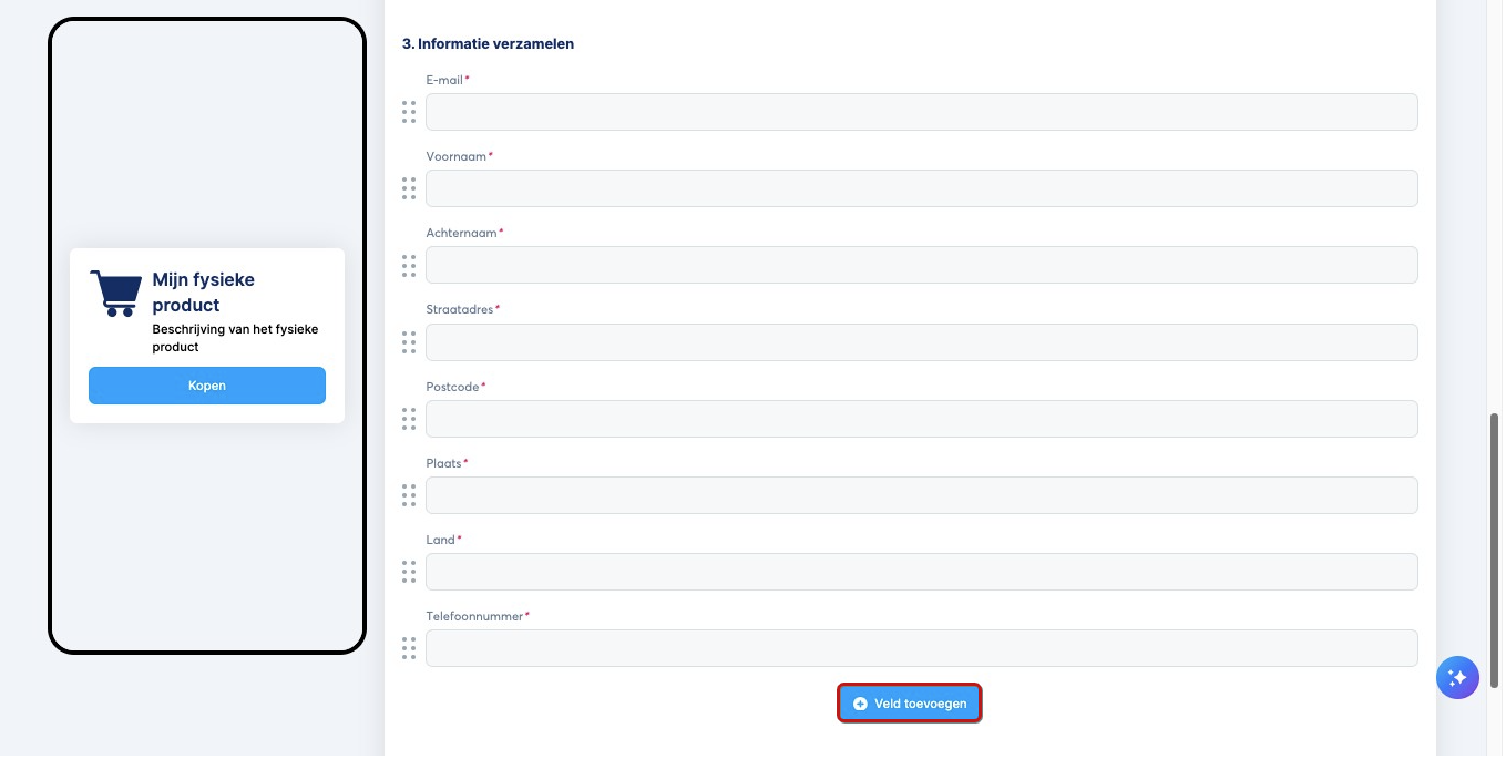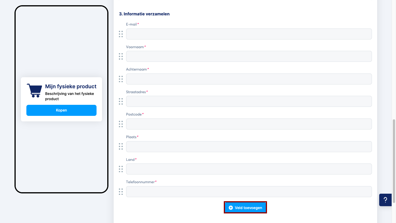 Wanneer je naar beneden scrolt, zie je de instellingen voor het betalingsformulier. Voeg de velden toe die je nodig hebt om de gewenste informatie te verzamelen; voor fysieke producten zijn standaard veel velden inbegrepen, zoals e-mail, voornaam, achternaam, straatadres, postcode, enz., maar je kunt ook extra velden toevoegen door op Veld toevoegen te klikken.