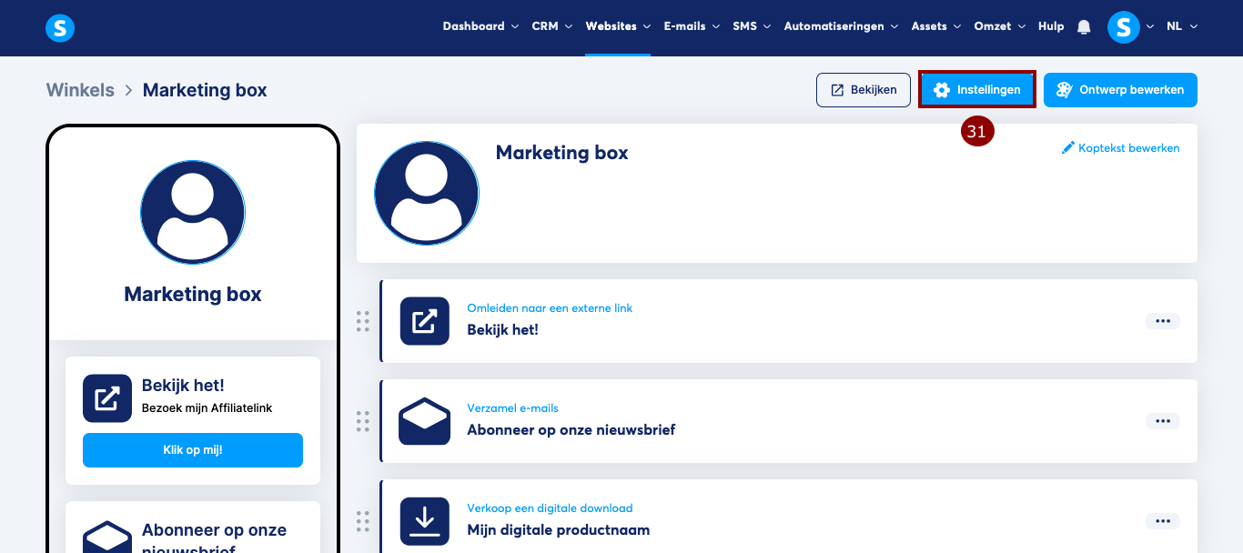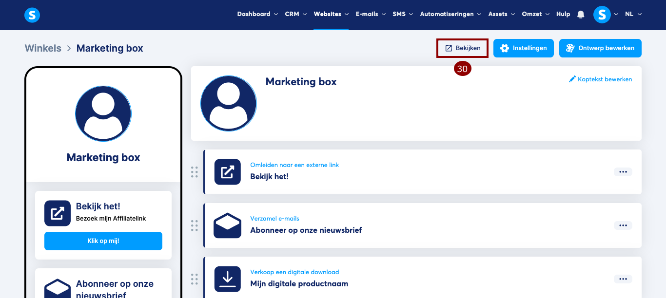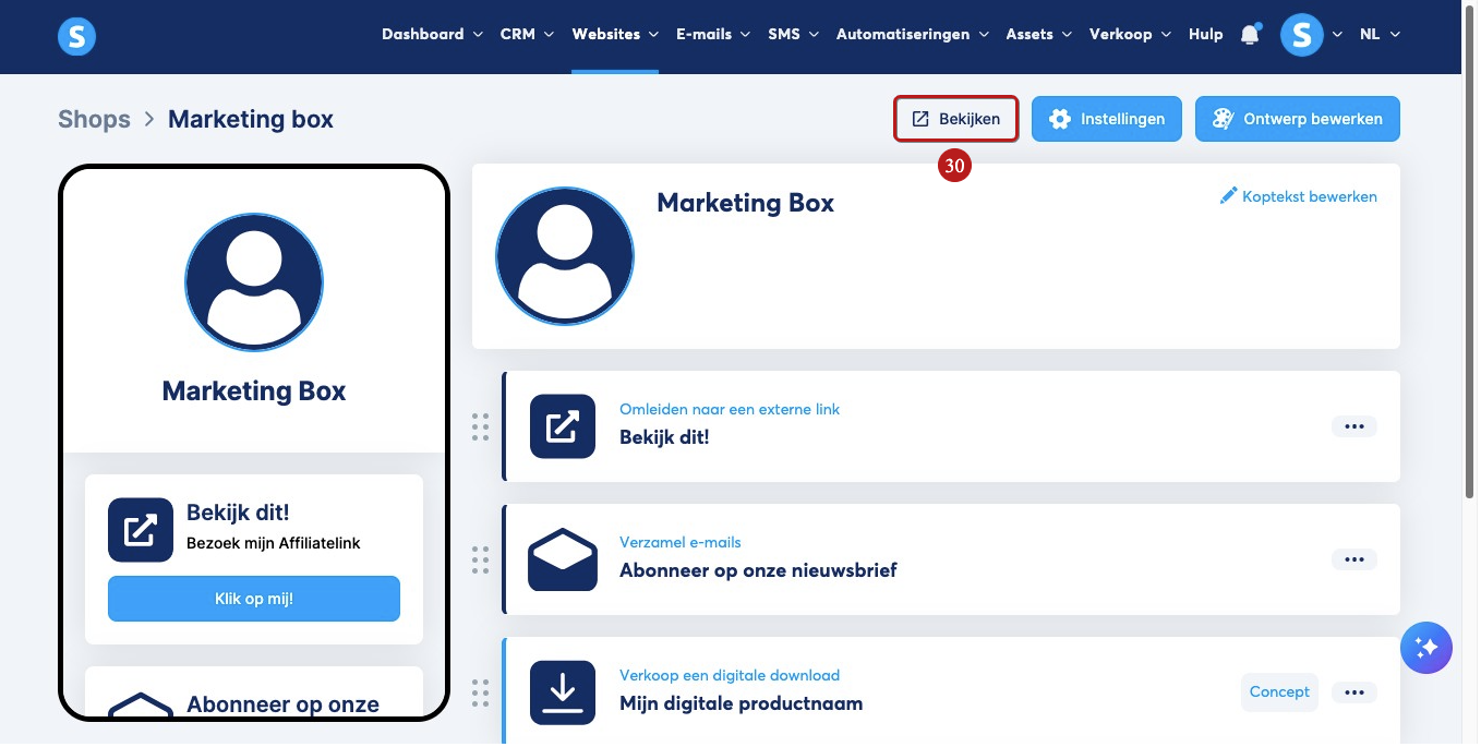 Om de uiteindelijke weergave van je winkel te bekijken, klik je op Bekijken (30).