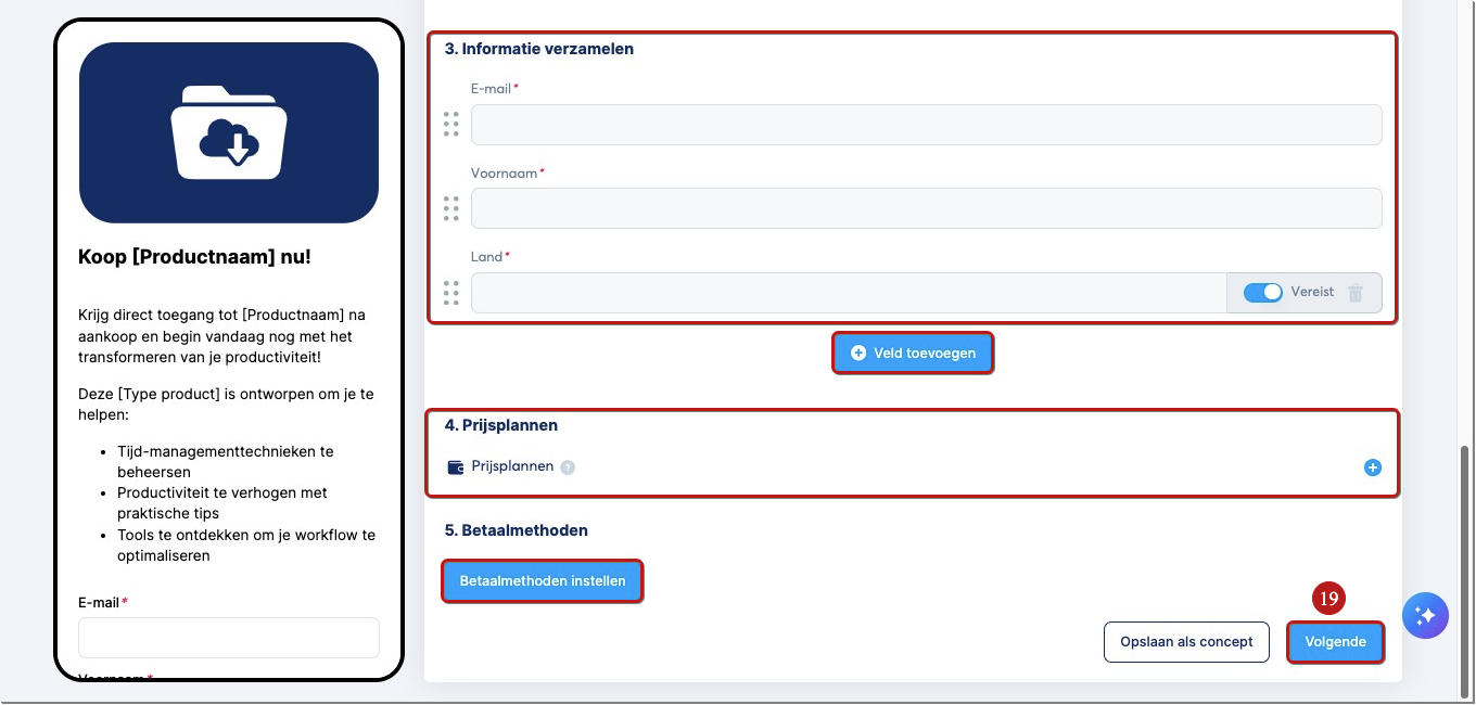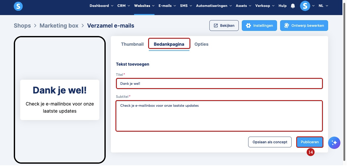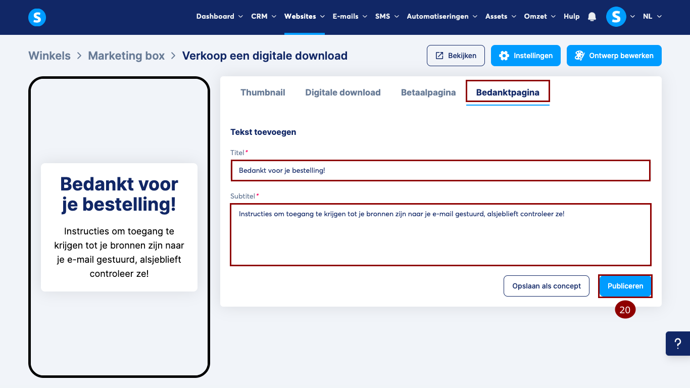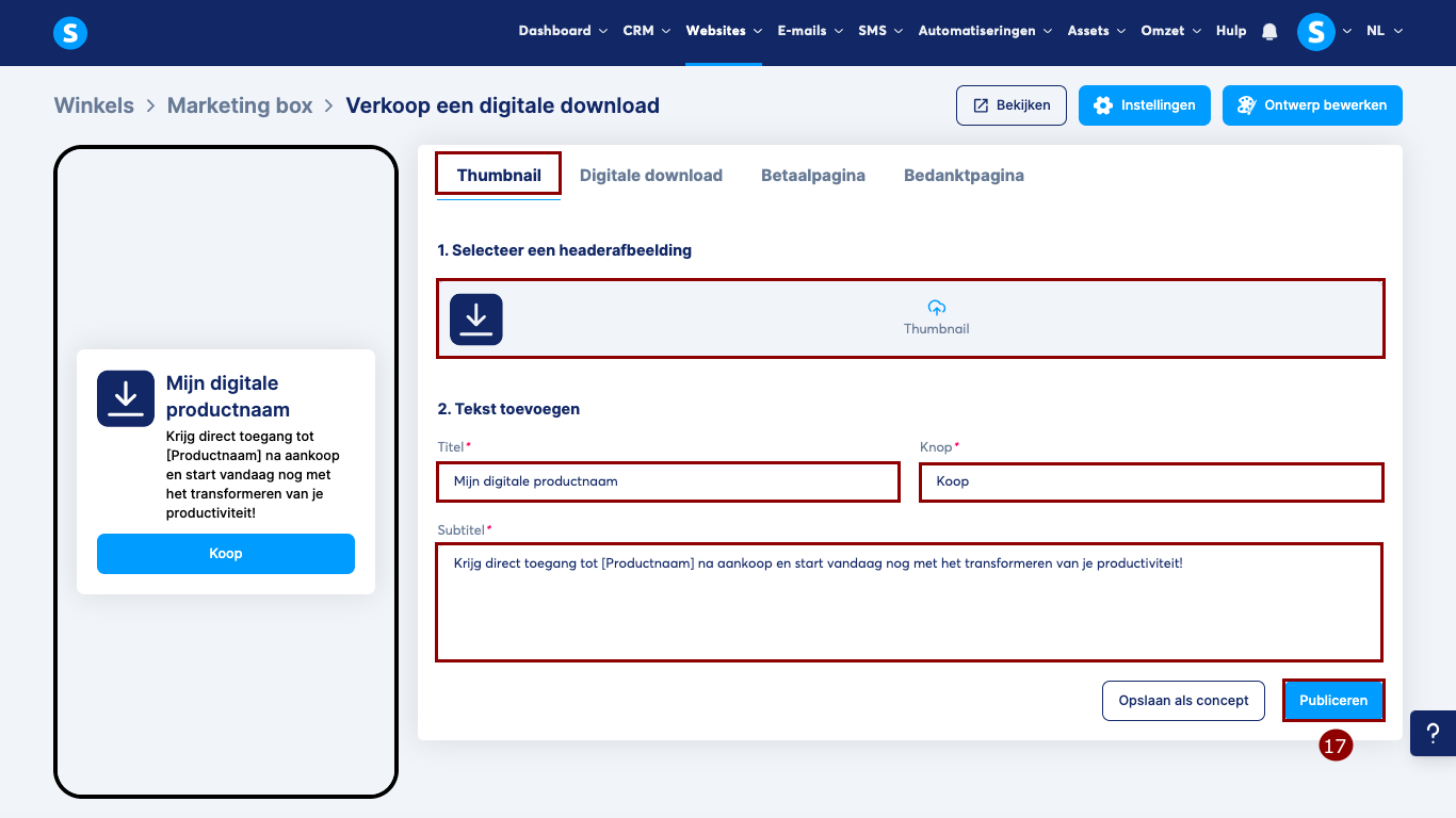 Klik tot slot op Publiceren (14) om je e-mailverzamelproduct zichtbaar te maken in je winkel.