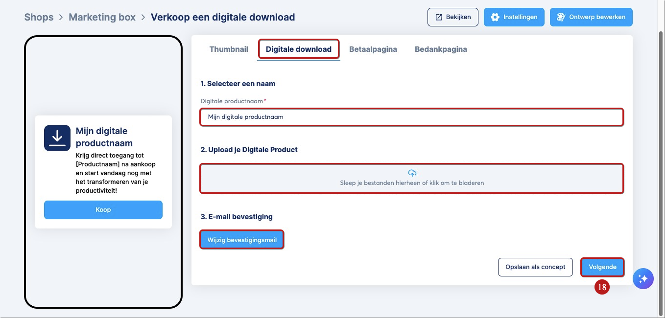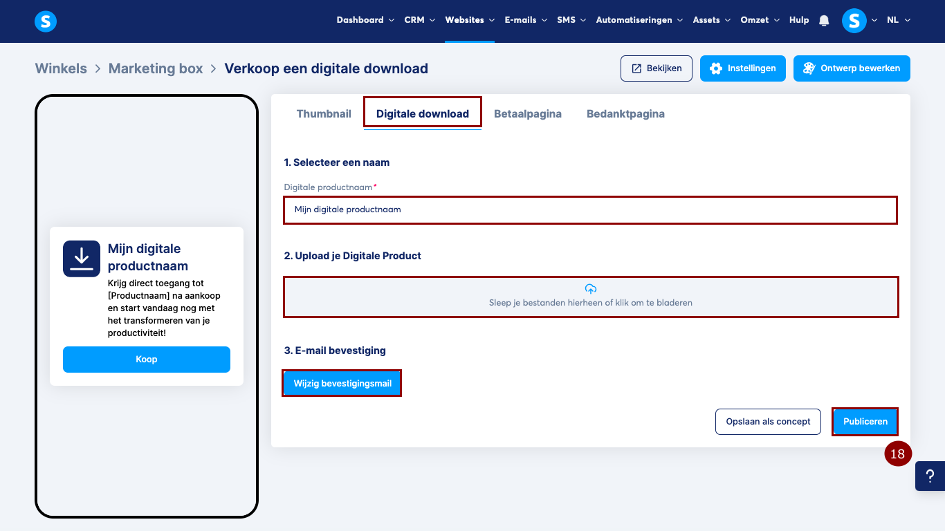 2. Digitale download: geef een titel aan je digitale product, upload het en pas de bevestigingsmail aan die automatisch naar je klanten wordt gestuurd na betaling.