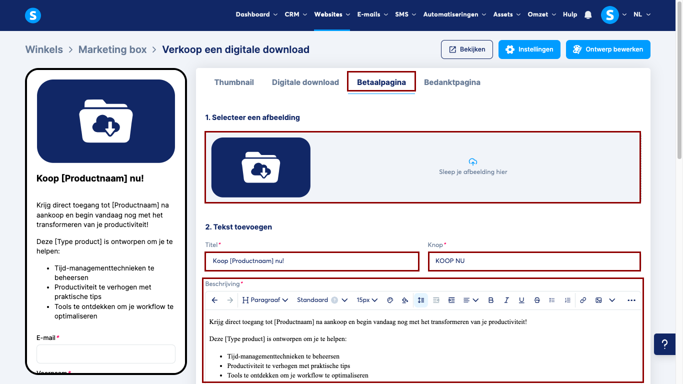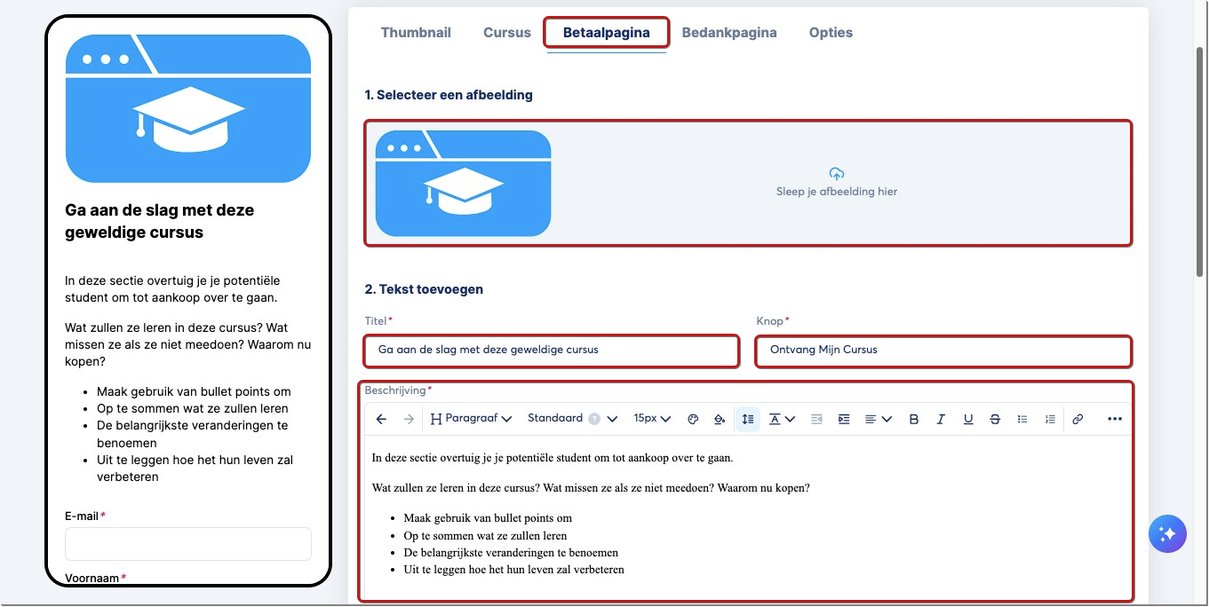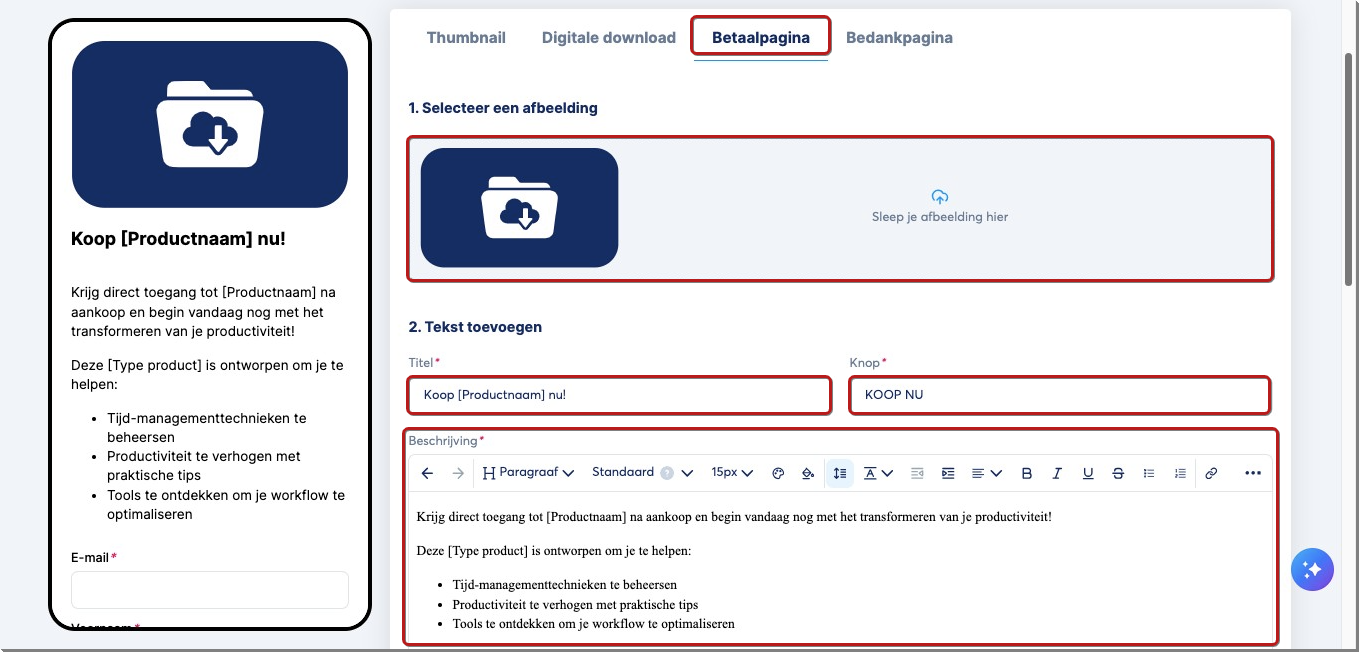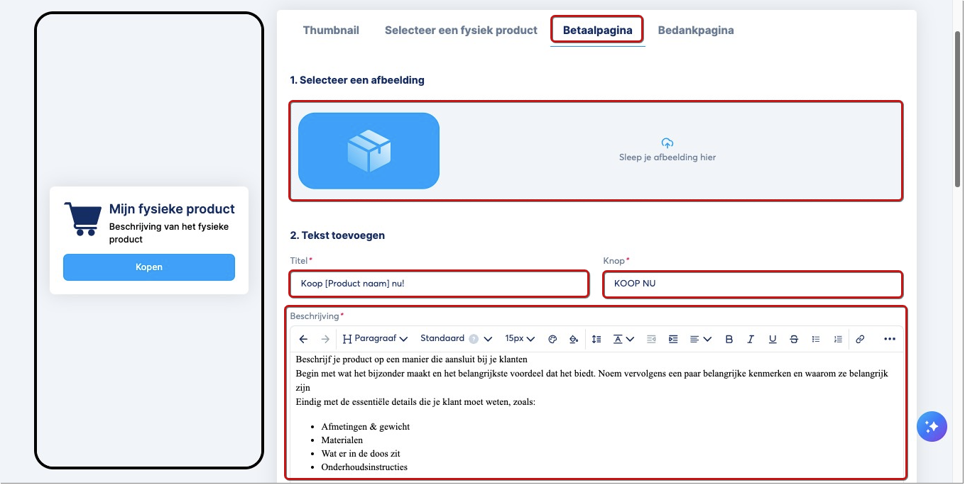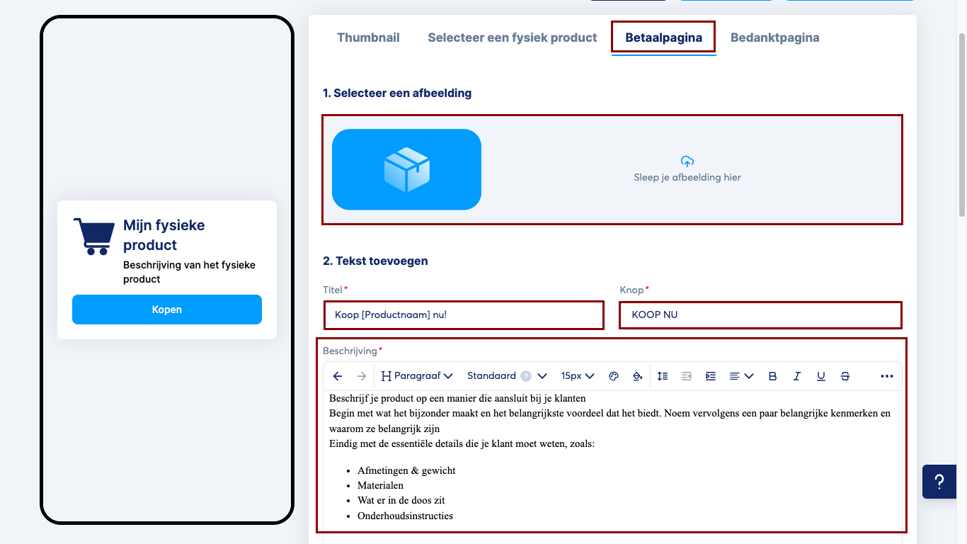 3. Checkout-pagina (betaalpagina): Voeg een afbeelding toe voor je product, evenals tekst met de titel, knop en beschrijving.