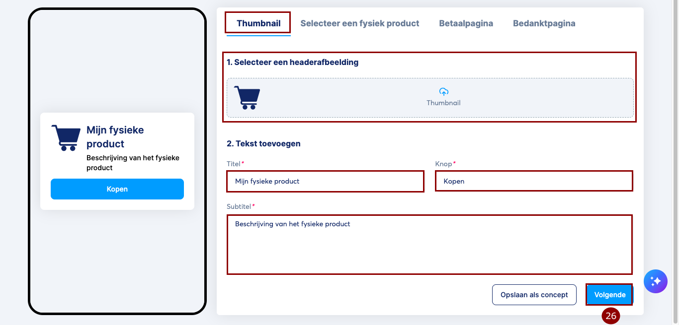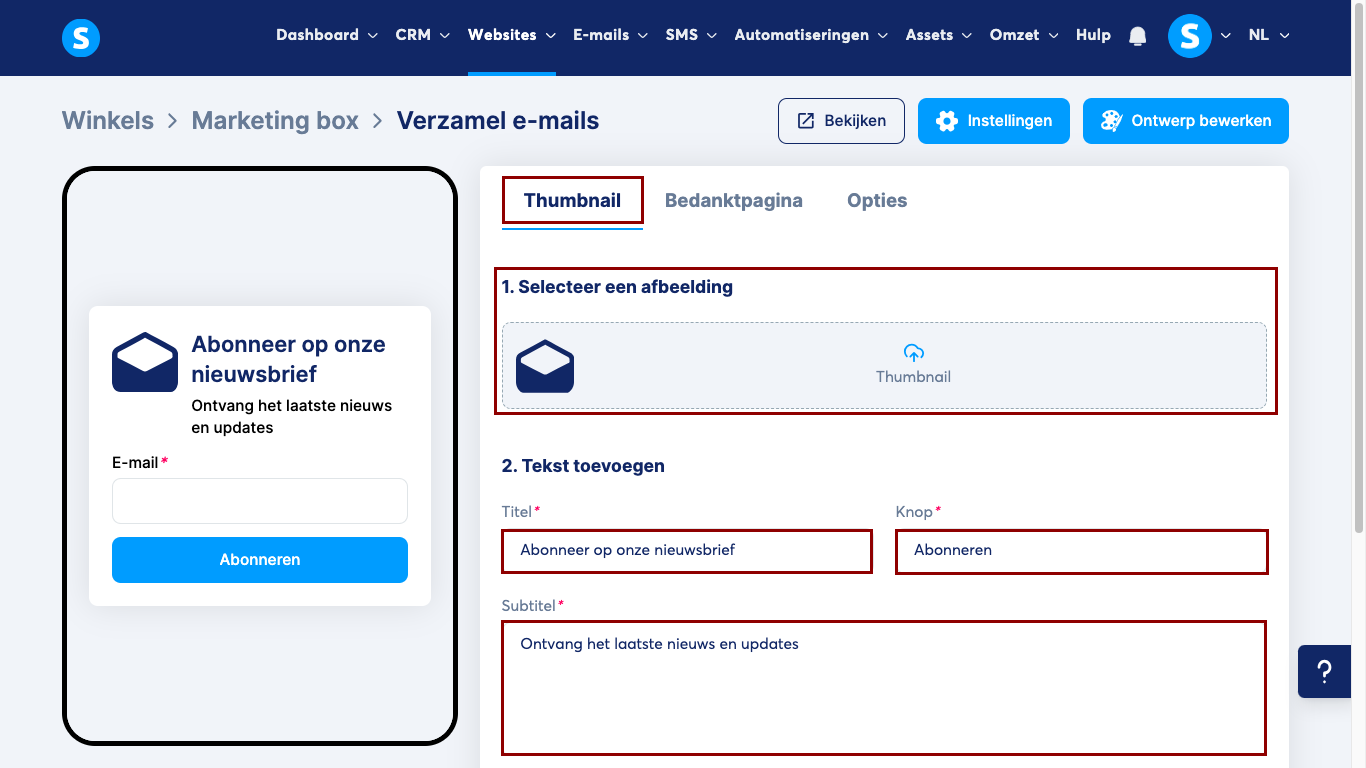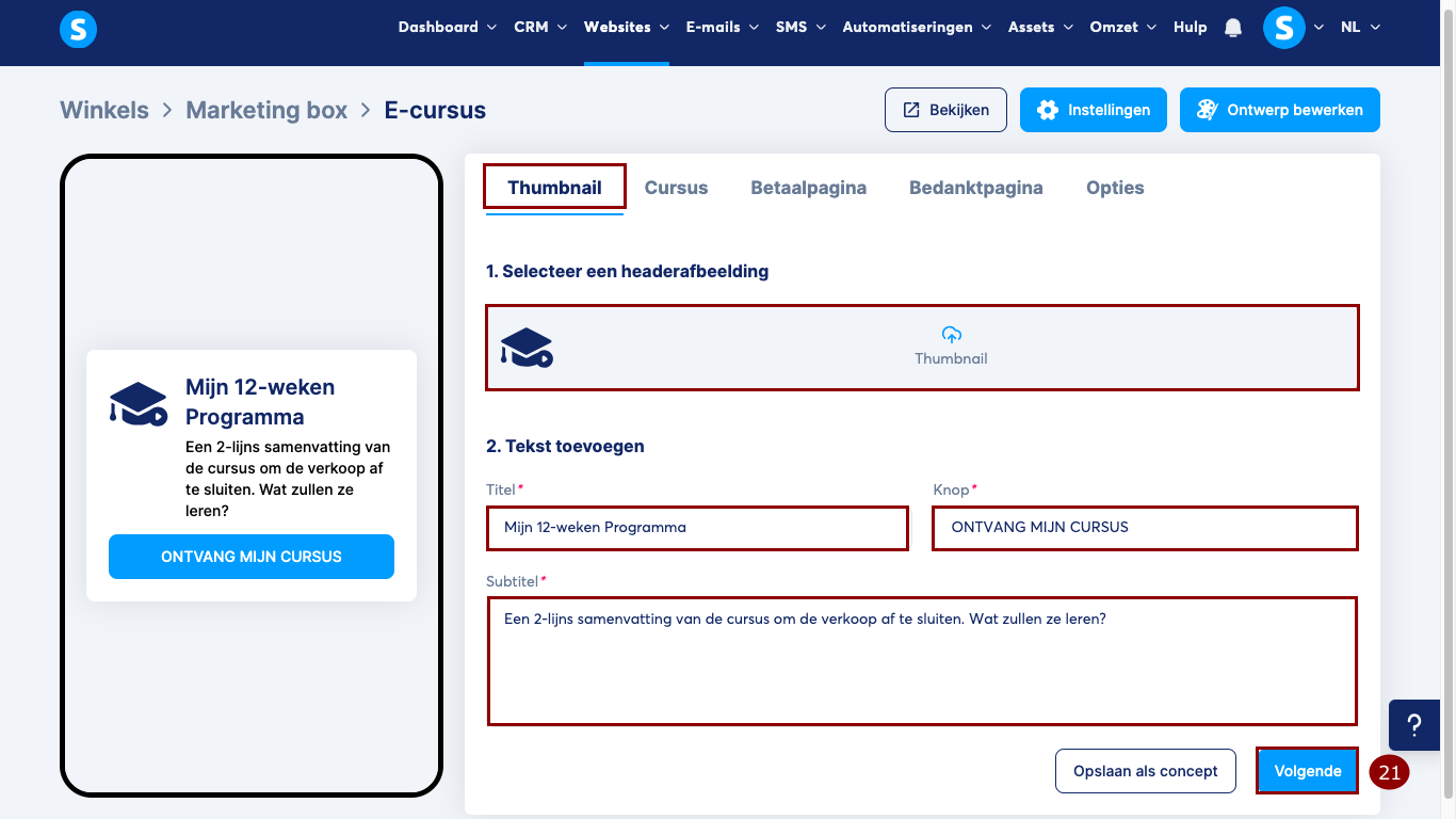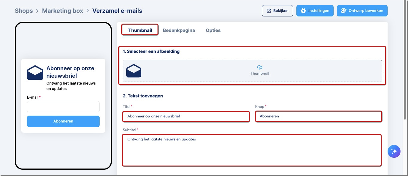 1. Thumbnail: Je moet de gewenste thumbnail-afbeelding selecteren en daarnaast de titel, knop en subtitel aanpassen.