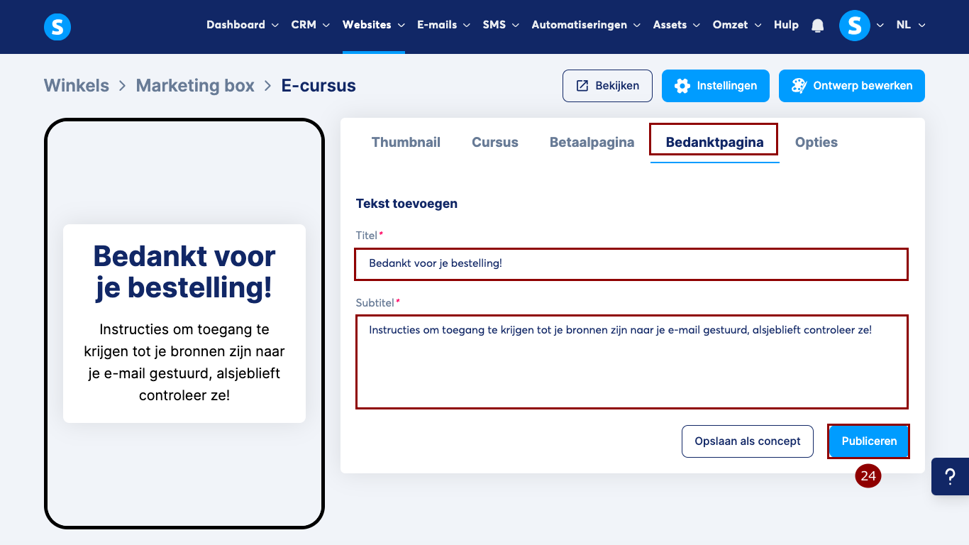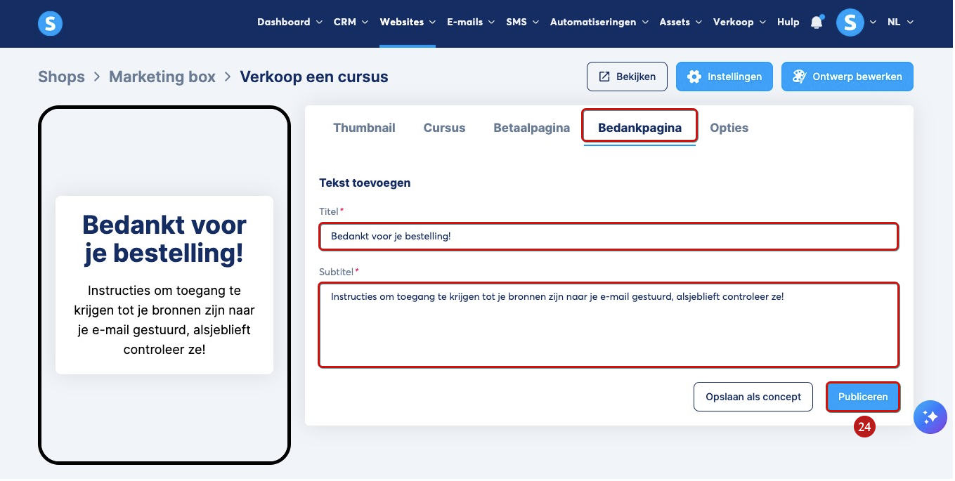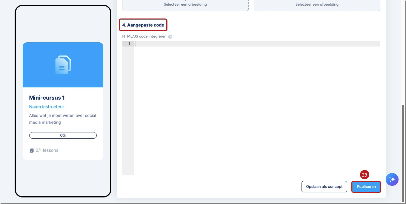 Als je klaar bent, klik je op Publiceren (25) om op te slaan en je cursus beschikbaar te maken in je winkel.
