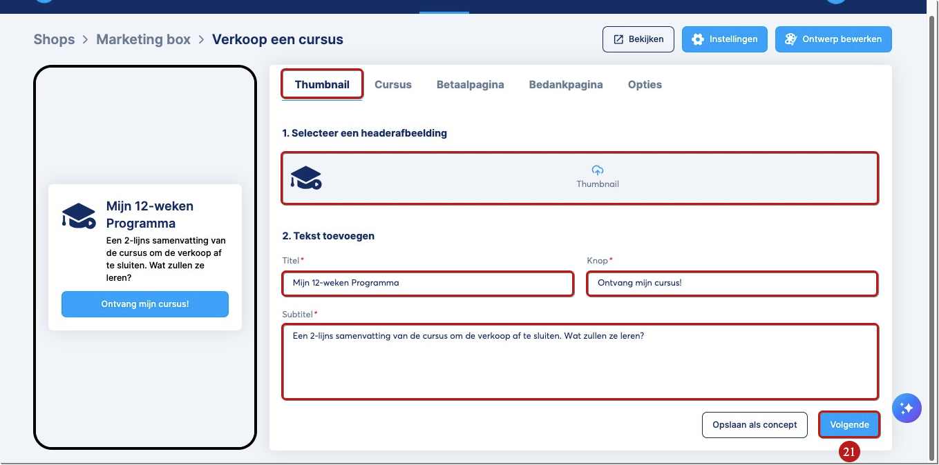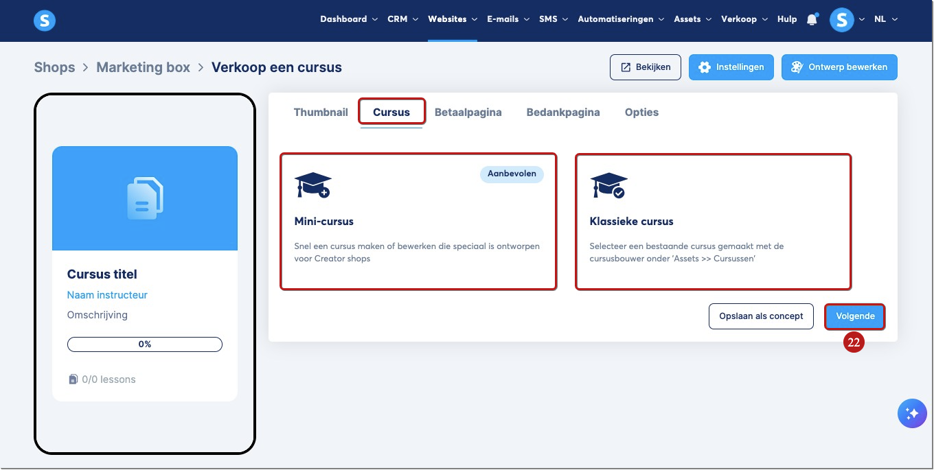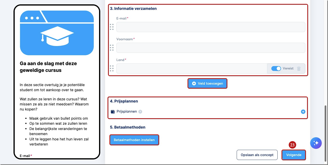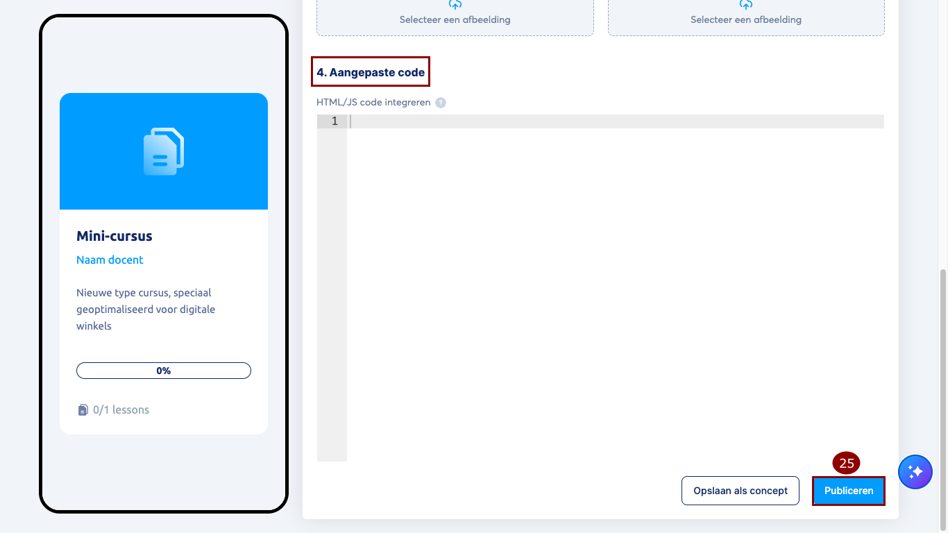 Als je klaar bent, klik je op Publiceren (25) om op te slaan en je cursus beschikbaar te maken in je winkel.