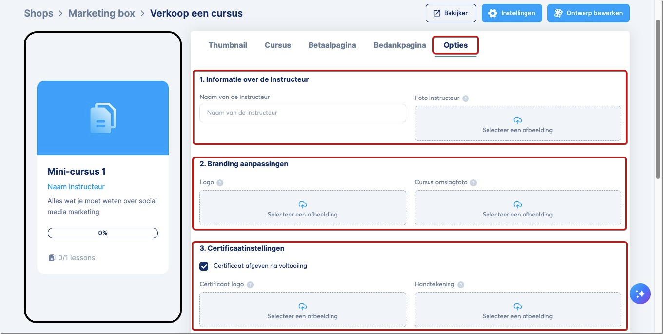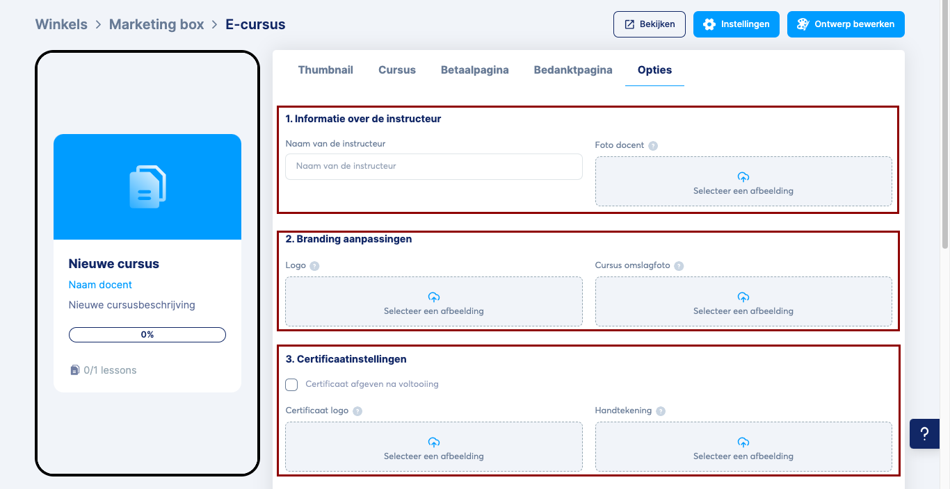 Voeg de gegevens van de docent toe (naam en foto), pas de branding aan door je logo en cursuscover te uploaden, en stel de certificaatinstellingen in, zoals het toevoegen van een certificaatlogo en handtekening, of het inschakelen van de optie om een certificaat uit te reiken na voltooiing.