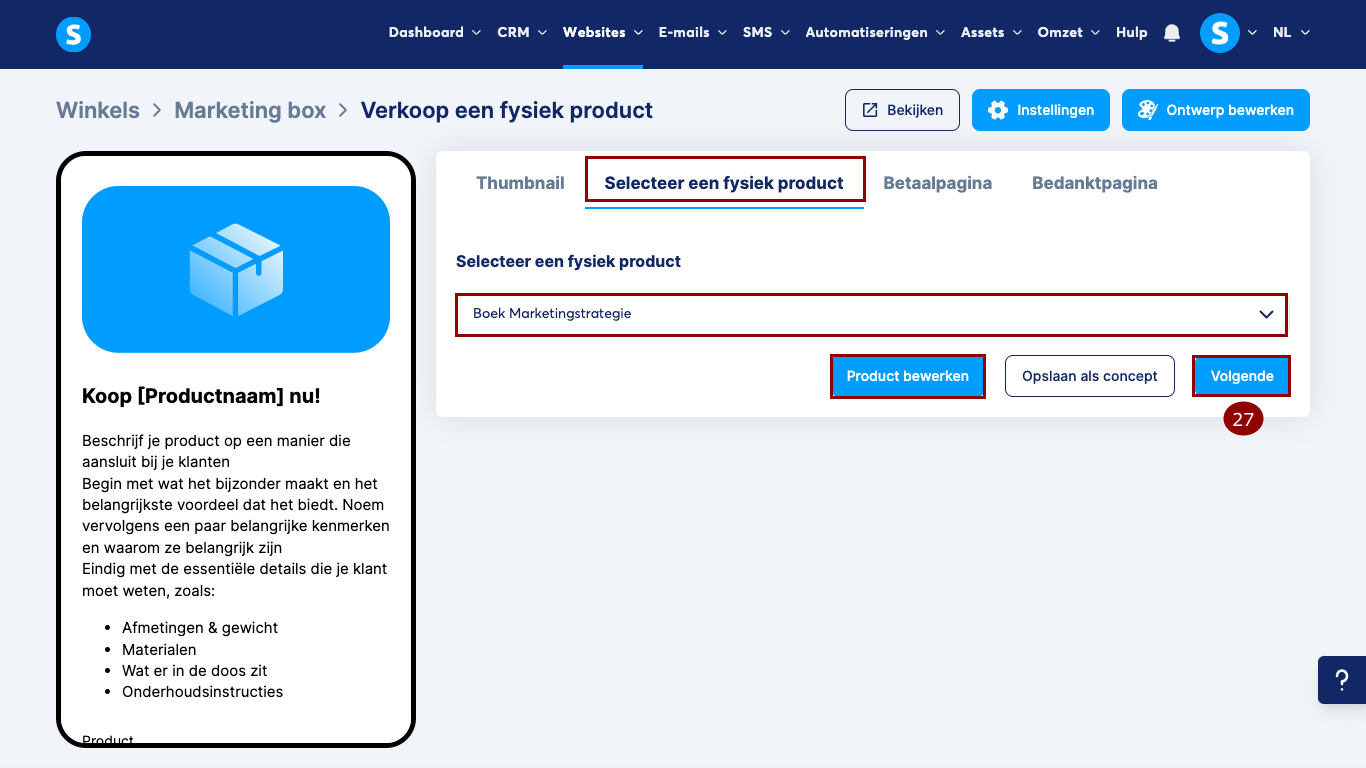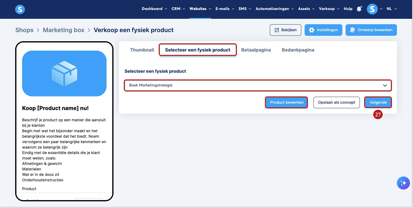 2. Selecteer een fysiek product: Selecteer een digitaal product dat al is aangemaakt in je systeme.io-account. Zodra het is geselecteerd, kun je het bewerken door op Product bewerken te klikken, en klik vervolgens op Volgende (27) om op te slaan en door te gaan naar het volgende tabblad.