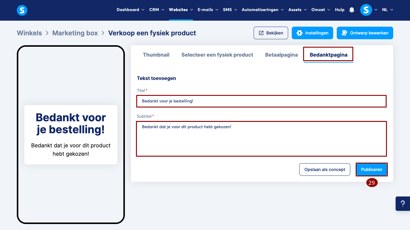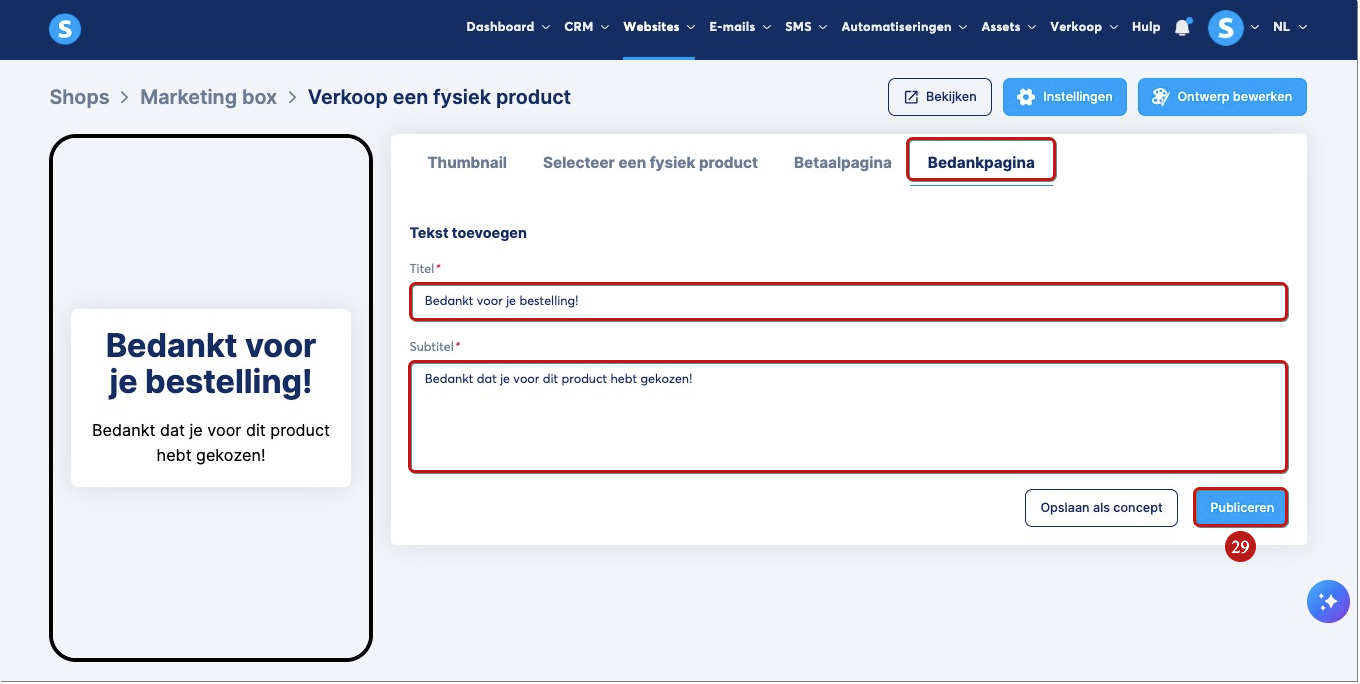 Klik tot slot op Publiceren (29) om je product zichtbaar te maken in je winkel.