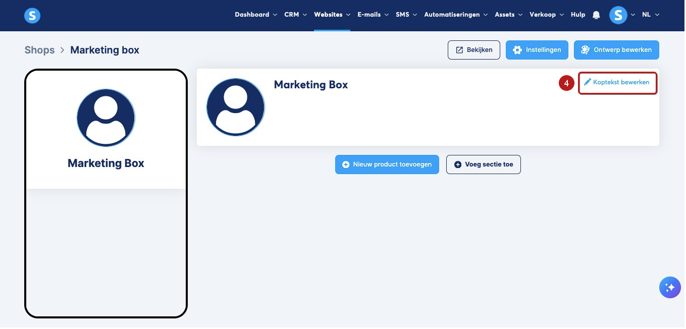 Je kunt op Koptekst bewerken (4) klikken om de header van je online winkel aan te passen.