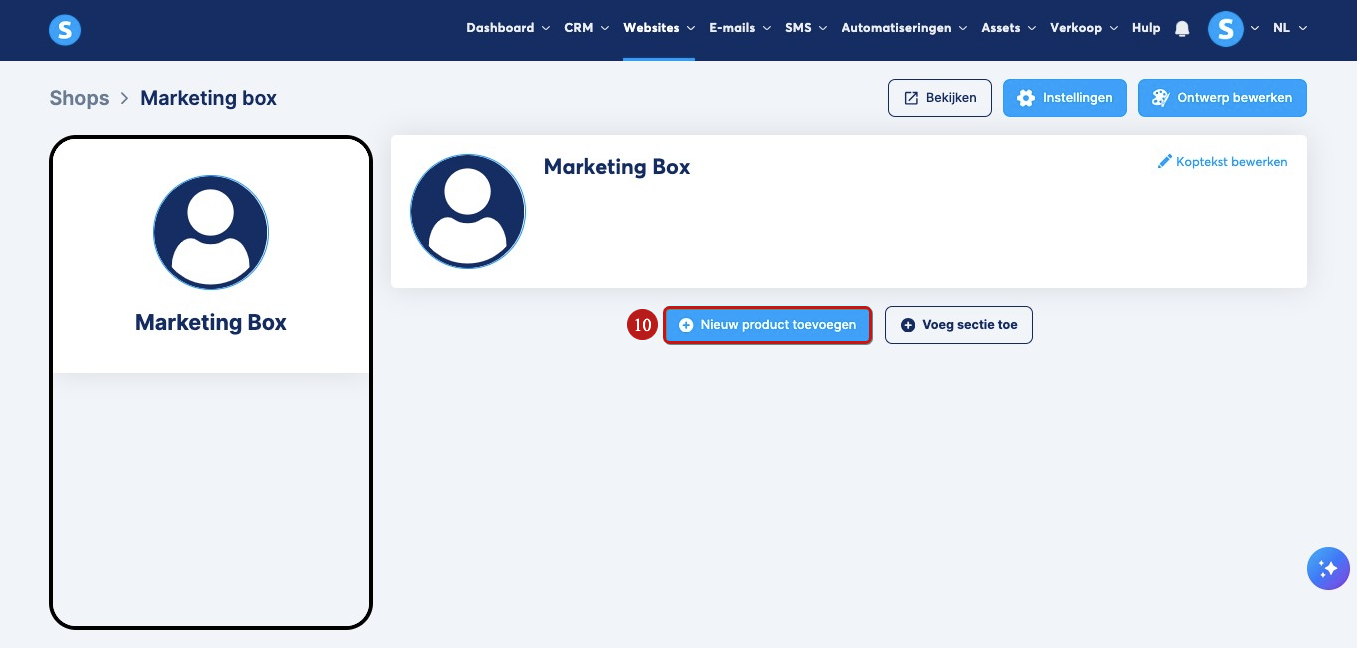Om een product aan te maken, klik je op Nieuw product toevoegen (10).
