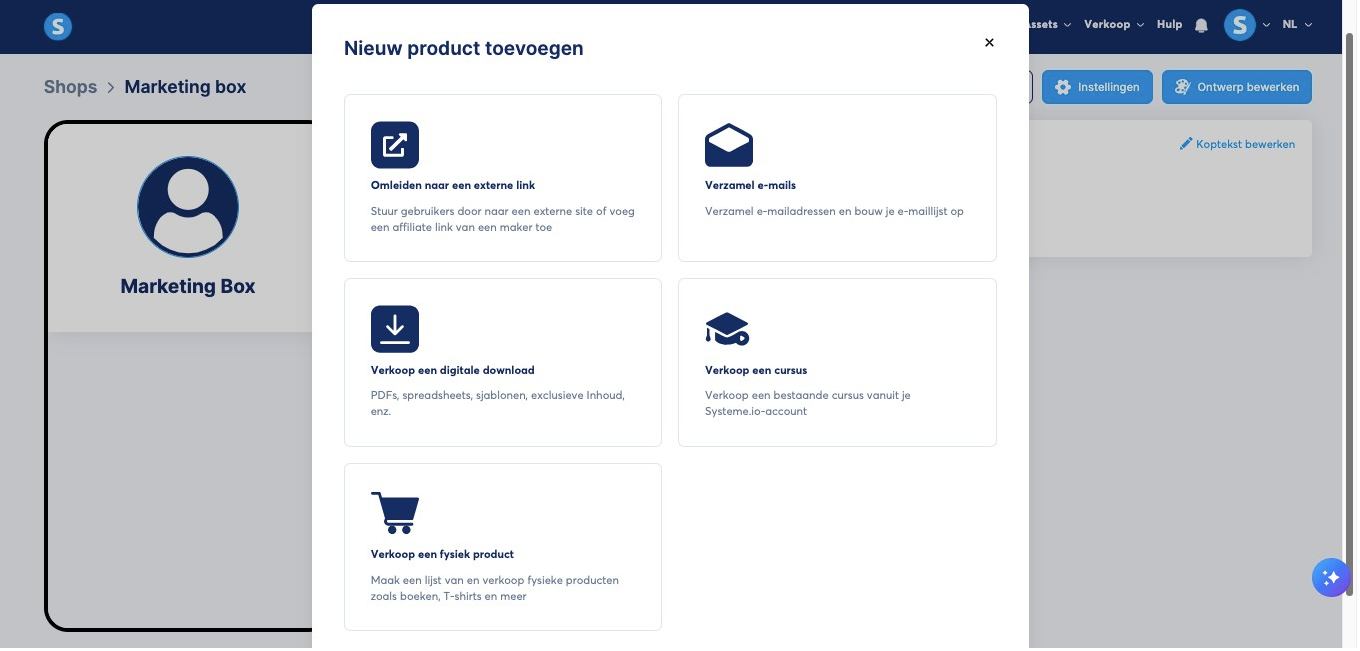 Je hebt de optie om verschillende soorten producten aan te maken: