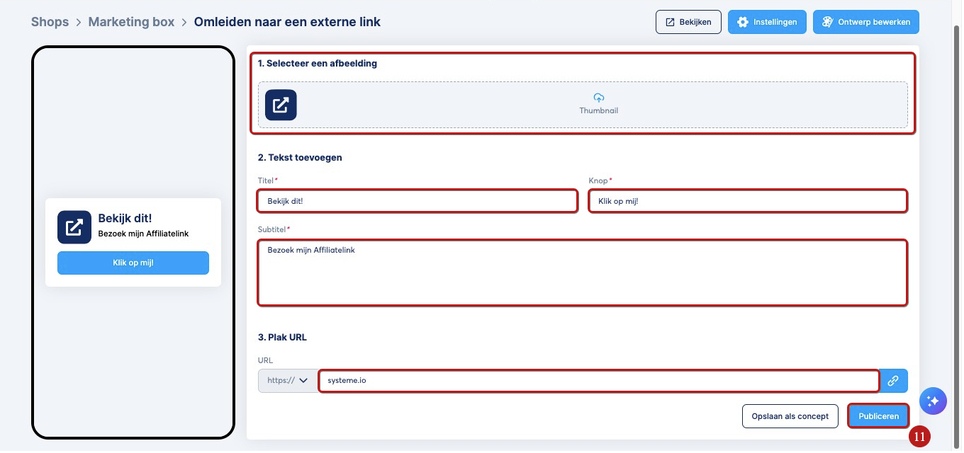 Je hoeft alleen een thumbnail-afbeelding, titel, knop, subtitel toe te voegen en de doorverwijzingslink voor de knop in te voegen. Klik vervolgens op Publiceren (11) om het zichtbaar te maken in je winkel.