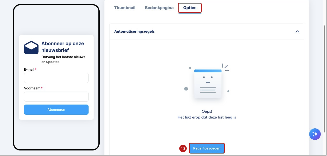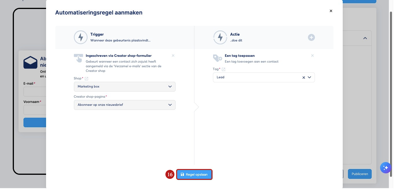 In het pop-upvenster dat verschijnt, kies je Ingeschreven via Creator shop-formulier als trigger en selecteer je vervolgens de actie die je wilt uitvoeren nadat een lead zich heeft aangemeld via het E-mails verzamelen-gedeelte van je digitale winkel (in dit voorbeeld hebben we gekozen om een tag toe te passen). Klik tot slot op Regel opslaan (16).