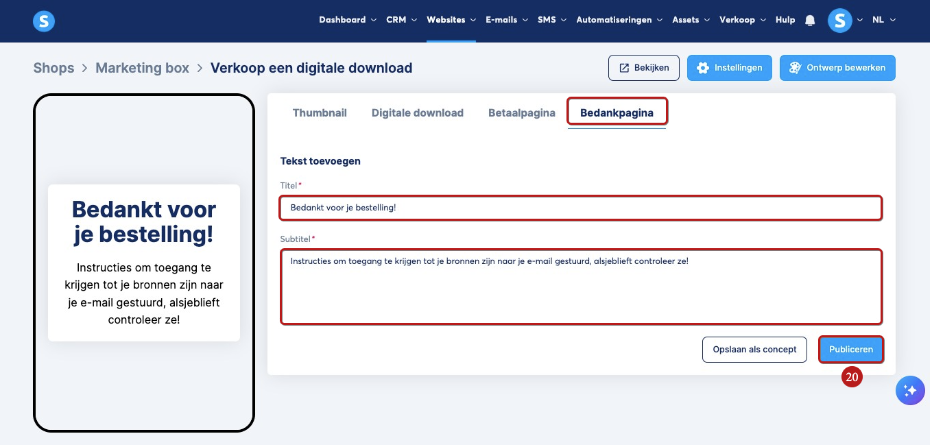 Klik tot slot op Publiceren (20) zodat je product te koop zichtbaar is in je winkel.