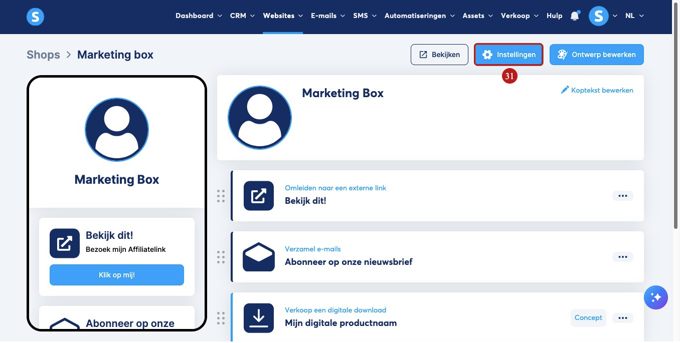 Zodra je je digitale producten hebt gepubliceerd, kun je de verschillende instellingen voor je Creator Shop configureren. Klik hiervoor op Instellingen (31).
