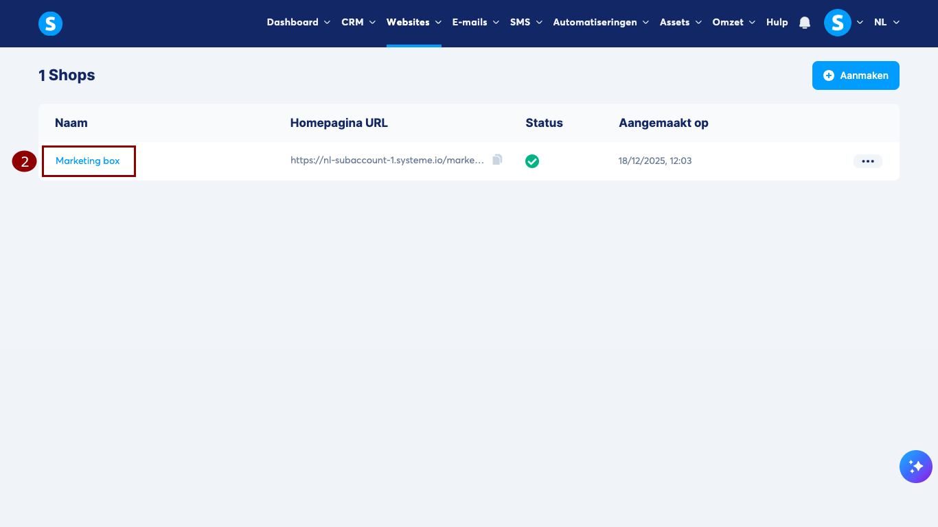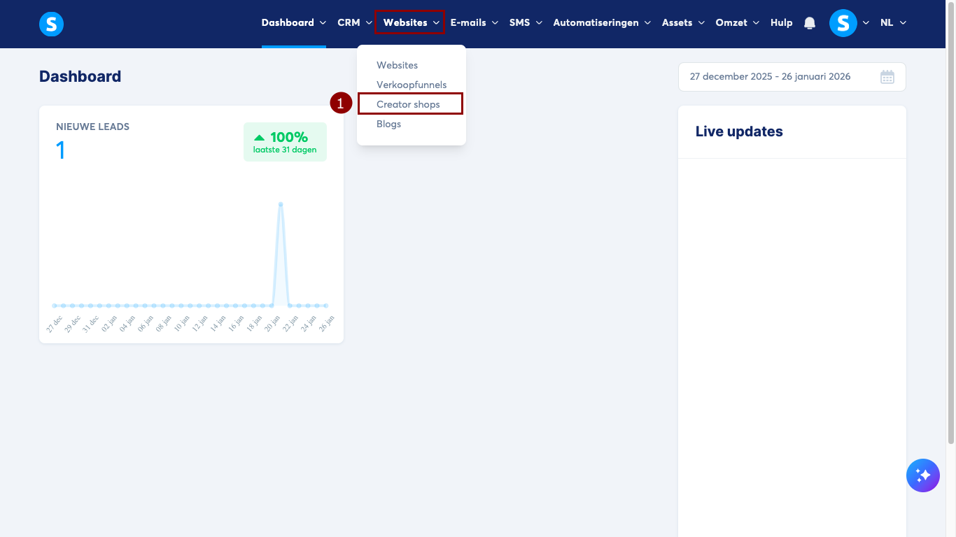 Ga naar het Websites-tabblad en klik op Creator shops (1).