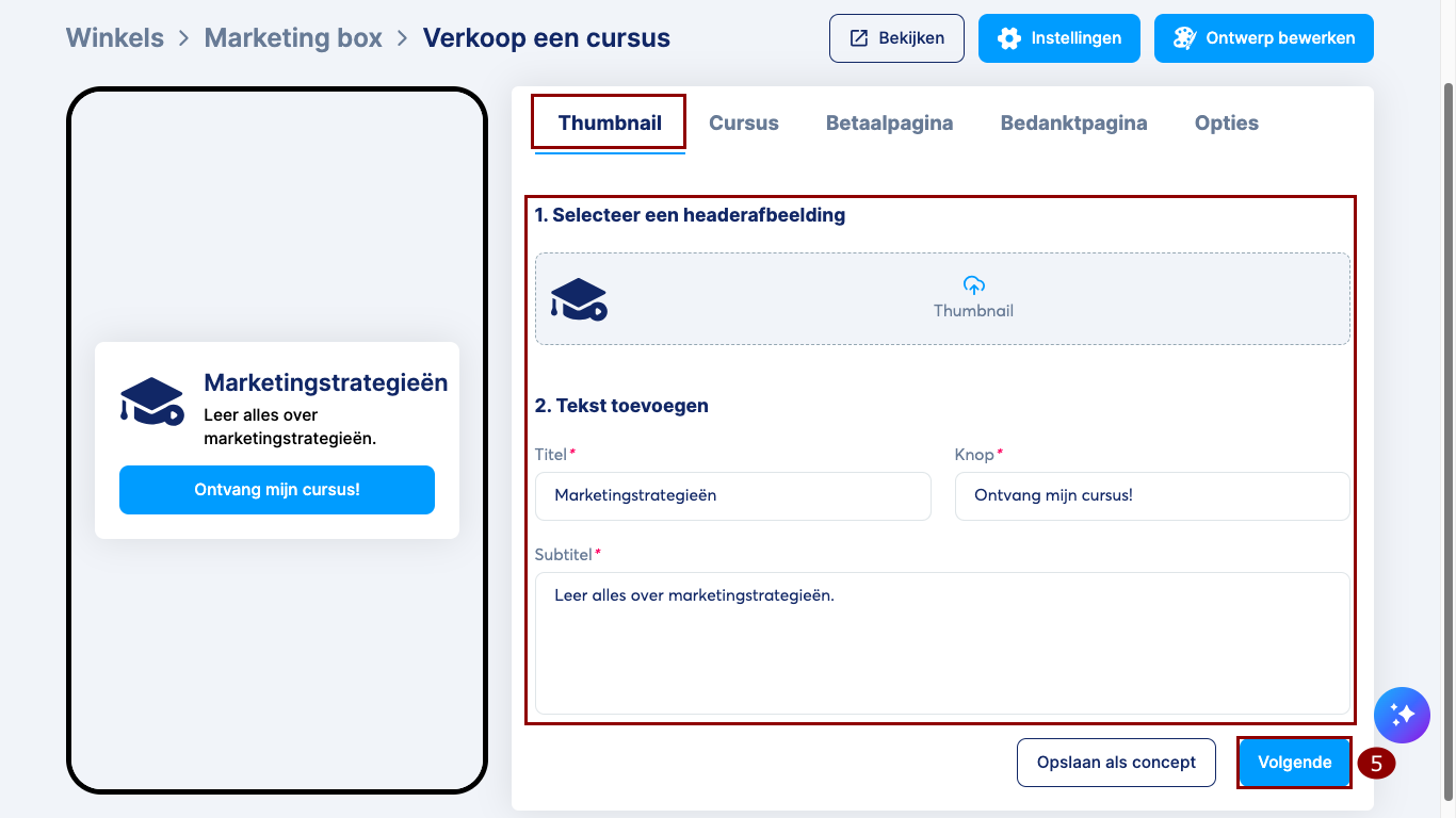 Ga naar het tabblad Thumbnail en pas je headerafbeelding, titel, knoptekst en subtitel aan.