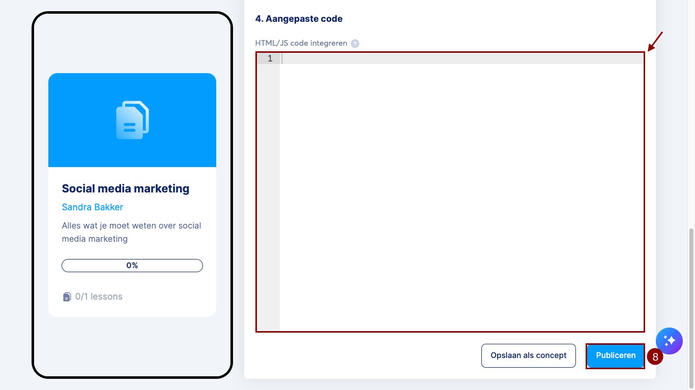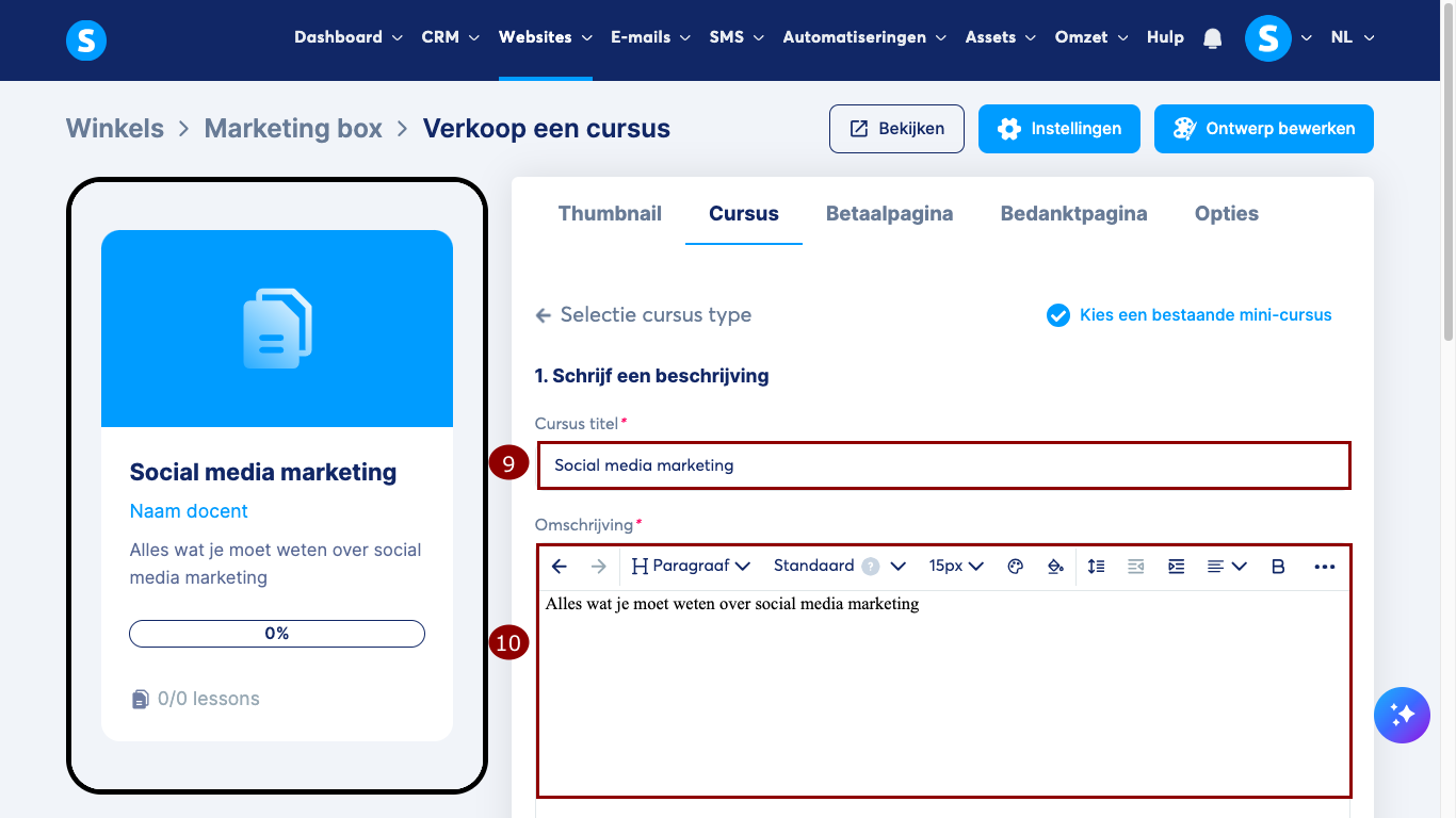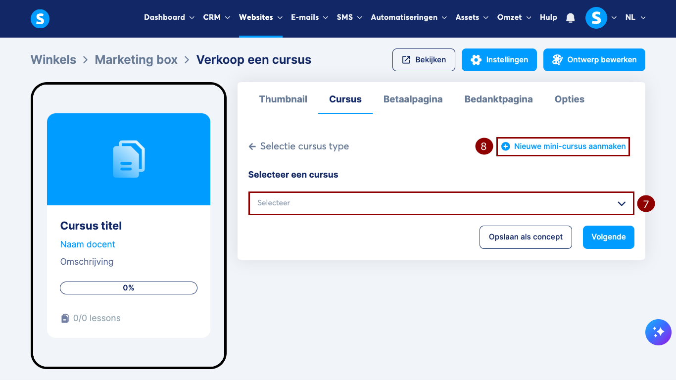 Selecteer een bestaande cursus (7) of klik op Nieuwe mini-cursus aanmaken (8).