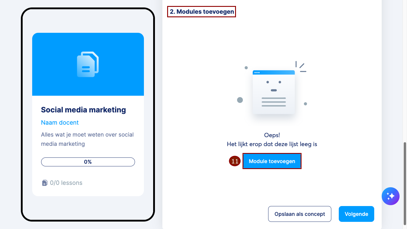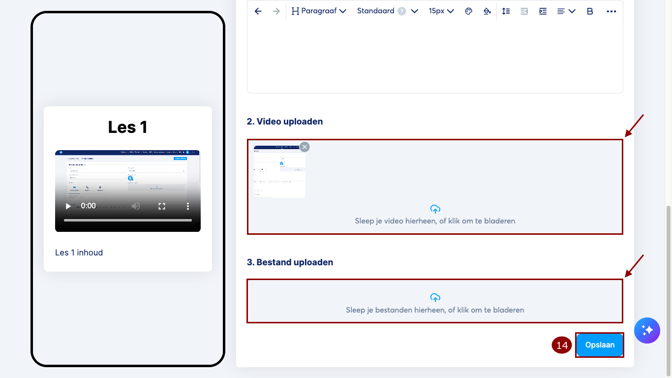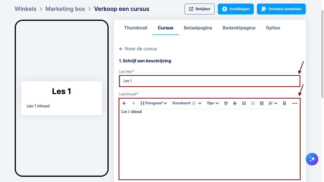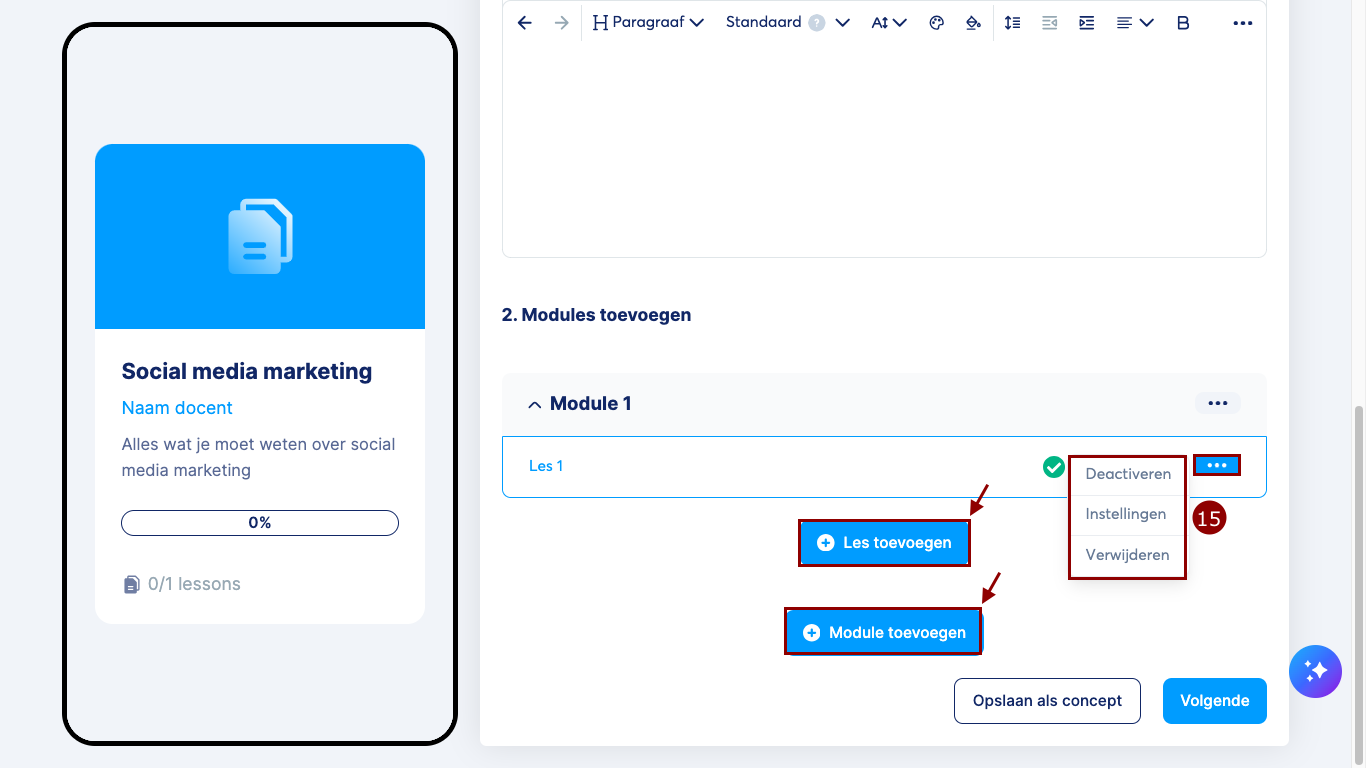 Je eerste les is klaar! Om een module of les te bewerken, klik op het menu met de drie puntjes (15) ernaast.