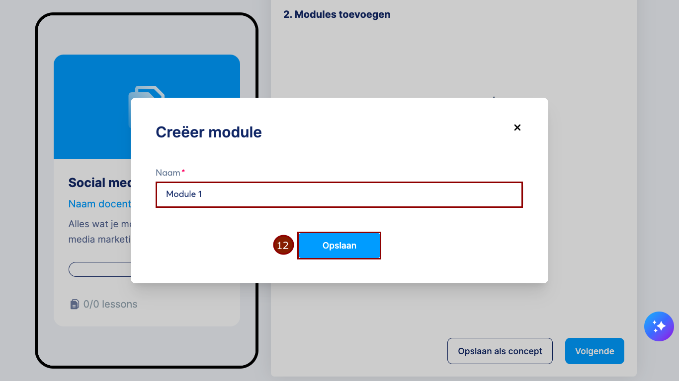 Voer in het pop-upvenster een naam voor je module in en klik op Opslaan (12).