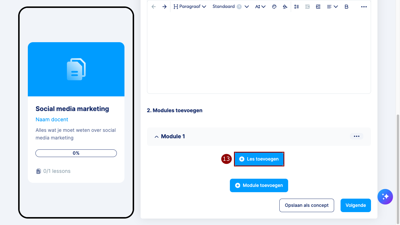 Klik op Les toevoegen (13) om inhoud aan de module toe te voegen.