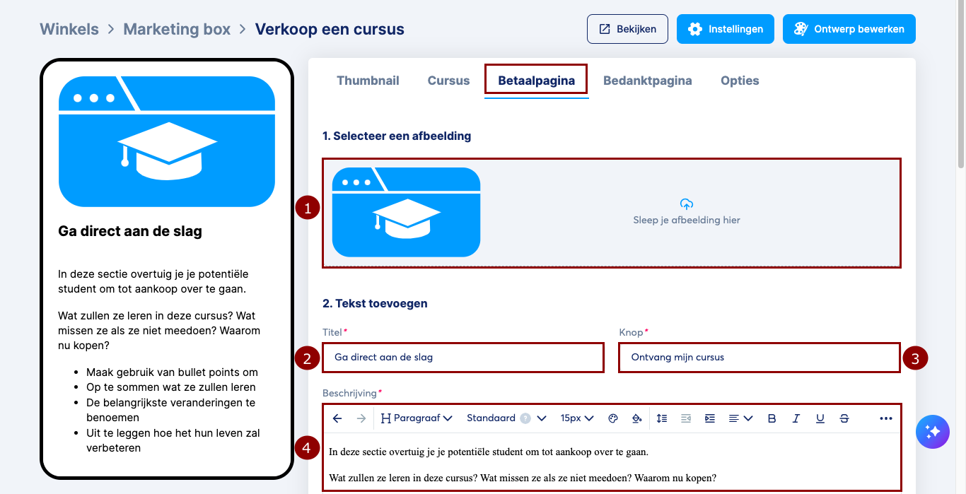 Klik op Volgende om de instellingen van de Checkout-pagina te openen. Hier moet je de Afbeelding (1), Titel (2), Knoptekst (3) en Beschrijving (4) instellen.